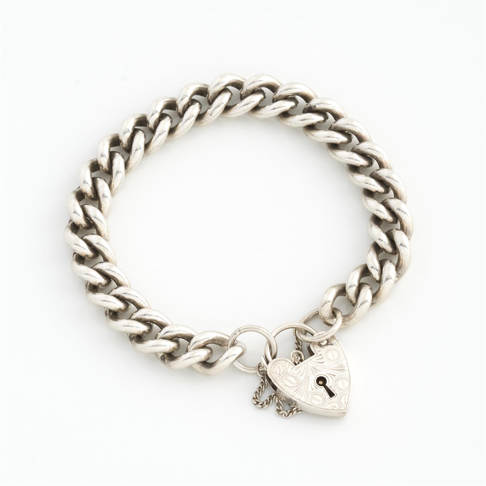 A CURBLINK CHAIN BRACELET TO A HEART PADLOCK CLASP IN STERLING SILVER, 200MM, 60.9GMS
