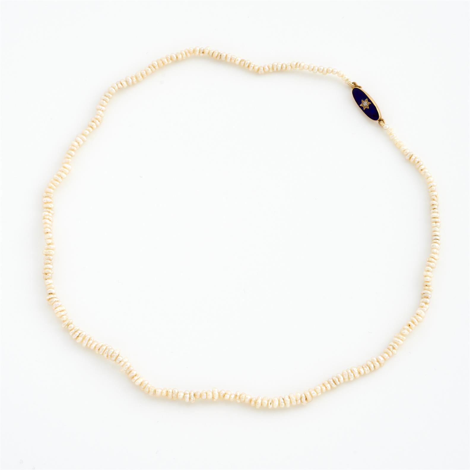 AN ANTIQUE NATURAL PEARL NECKLACE, TO A ENAMEL AND DIAMOND CLASP IN 15CT GOLD, 420MM