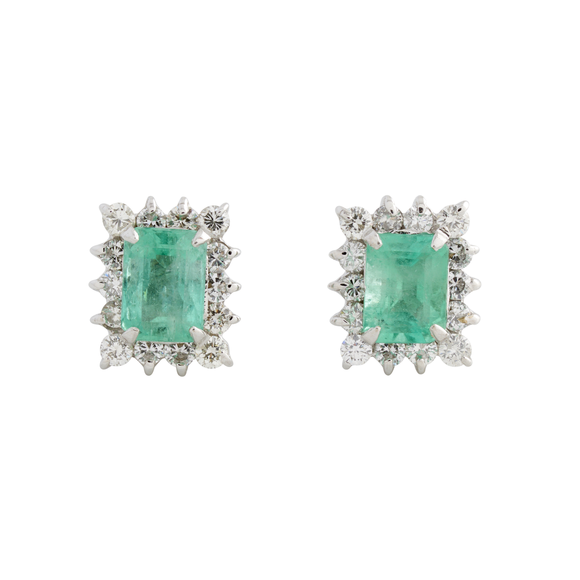 A PAIR OF EMERALD AND DIAMOND EARRINGS IN 18CT WHITE GOLD, THE EMERALDS TOTALLING 3.4CTS, THE DIAMONDS TOTALLING 1.12CTS, TO POST AND BUTTERFLY FITTINGS, ACCOMPANIED BY A VALUATION
