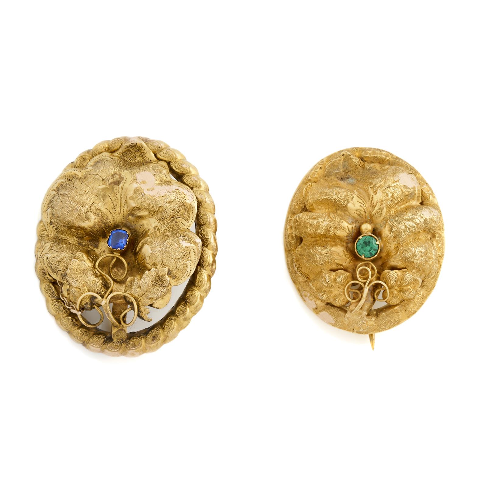 A PAIR OF ANTIQUE AUSTRALIAN GEM-SET BROOCHES IN GOLD PLATE, 35 X 30MM AND 40 X 35MM, 11.6GMS