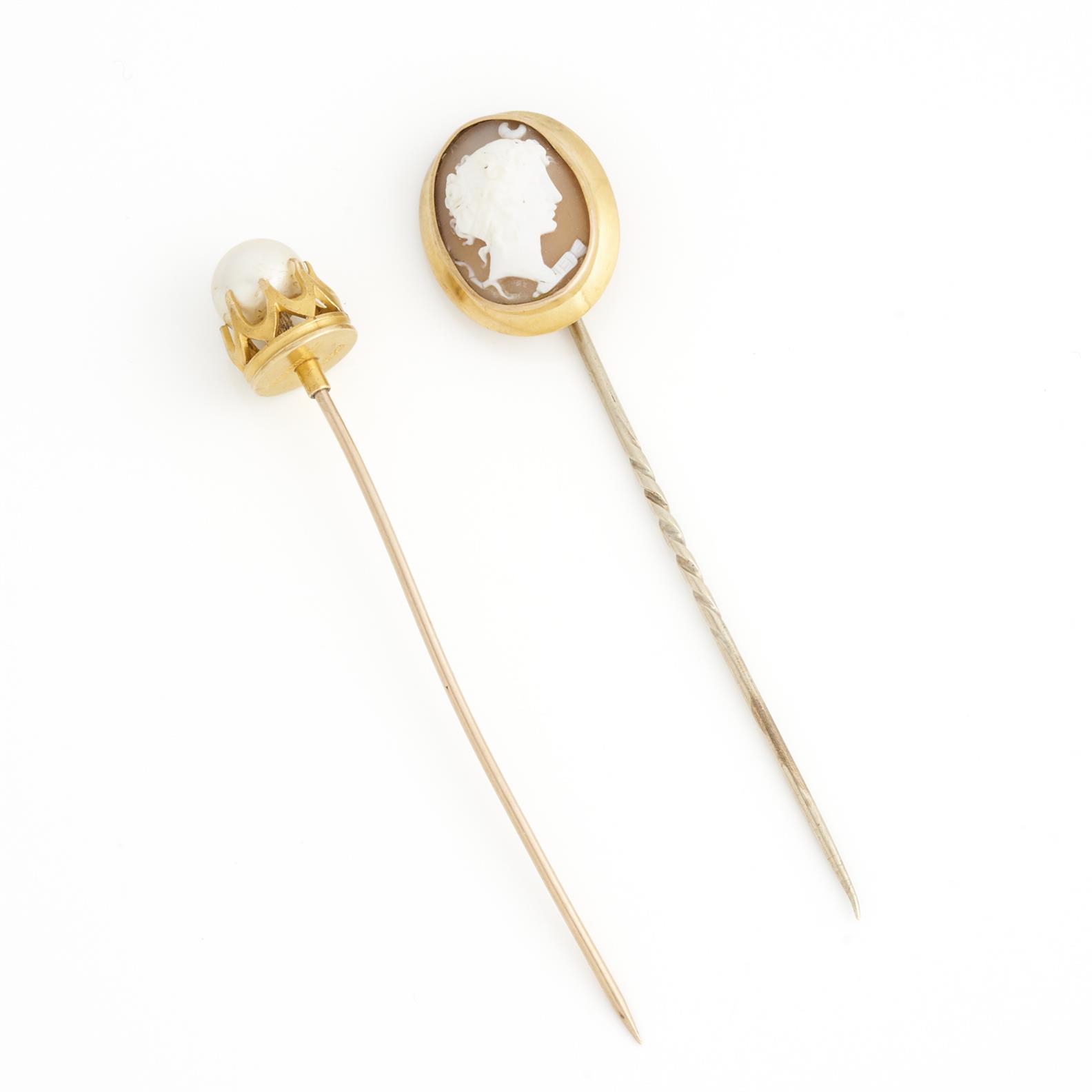 A PAIR OF BROOCHES IN 18CT GOLD, THE PEARL SET IN 18CT GOLD TO A PIN IN 9CT GOLD, STAMPED BRUNKHORST, THE CAMEO IN 18CT GOLD TO PIN IN BASE METAL, TOTAL WEIGHT 9.4GMS