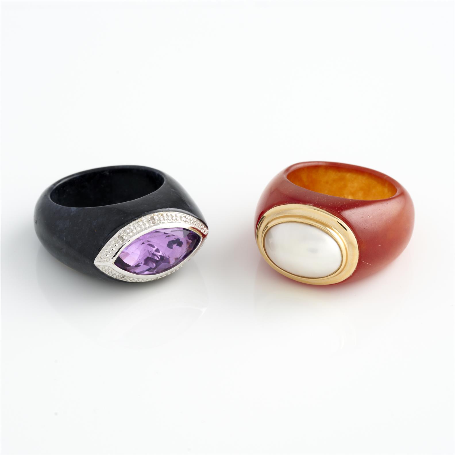 A PAIR OF GEM-SET COCKTAIL RINGS IN 14CT GOLD AND COMPOSITE, SIZE N AND P