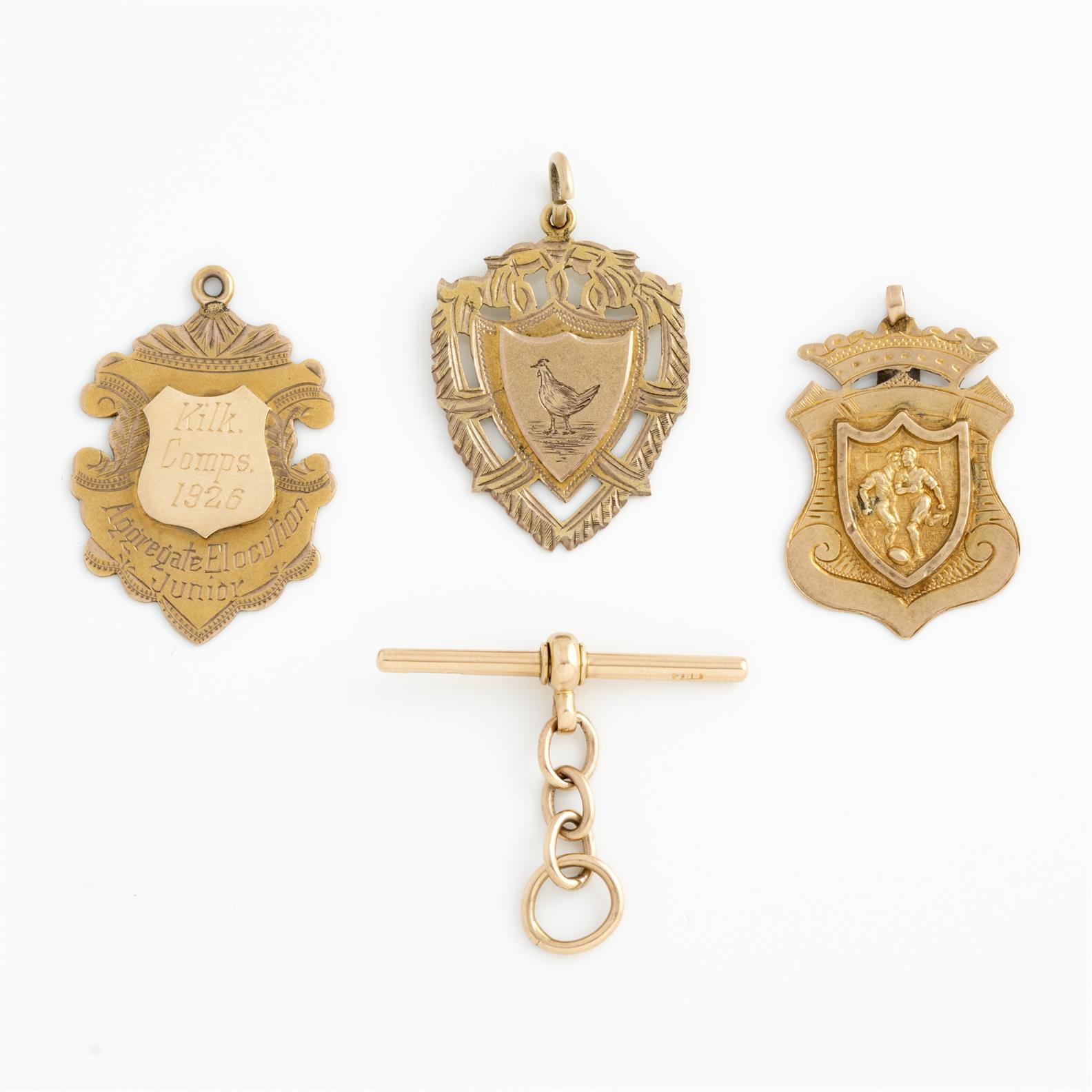 A COLLECTION OF THREE ANTIQUE MEDALLIONS IN 9CT GOLD, TOGETHER WITH A T-BAR IN 15CT GOLD, 18.4GMS
