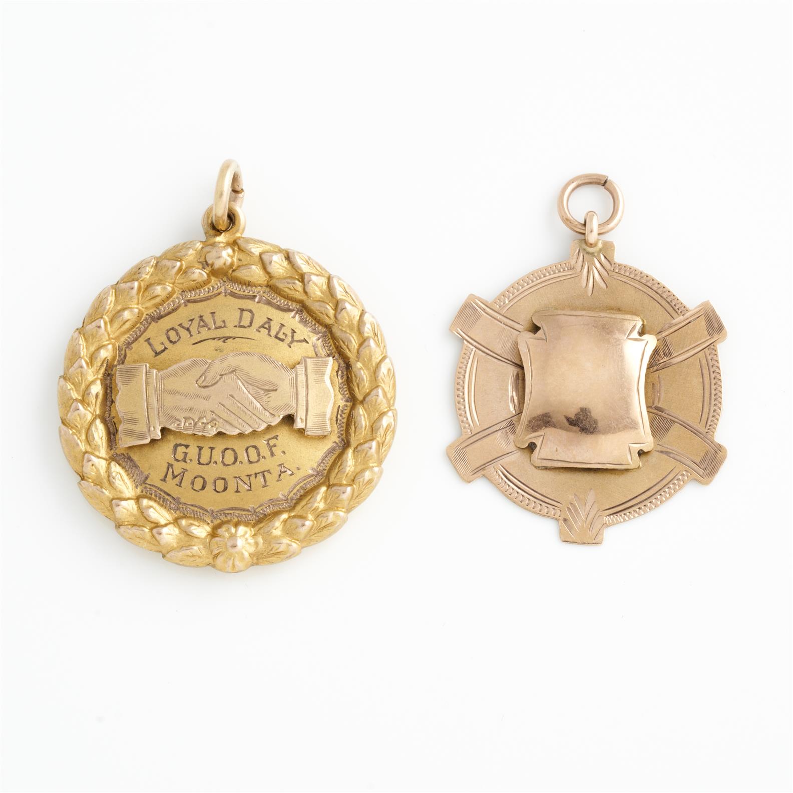 A PAIR OF MEDALLIONS IN 9CT GOLD, ONE MARKED WILLIS & SONS, 17.3GMS
