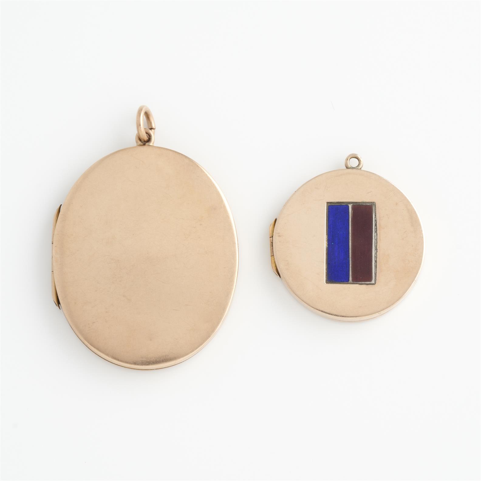 WILLIS & SONS, A HINGED LOCKET, 45 X 35MM, TOGETHER WITH AN ENAMELLED LOCKET, 30 X 30MM, BOTH TO OUTER CASES IN 9CT GOLD, 17.1GMS