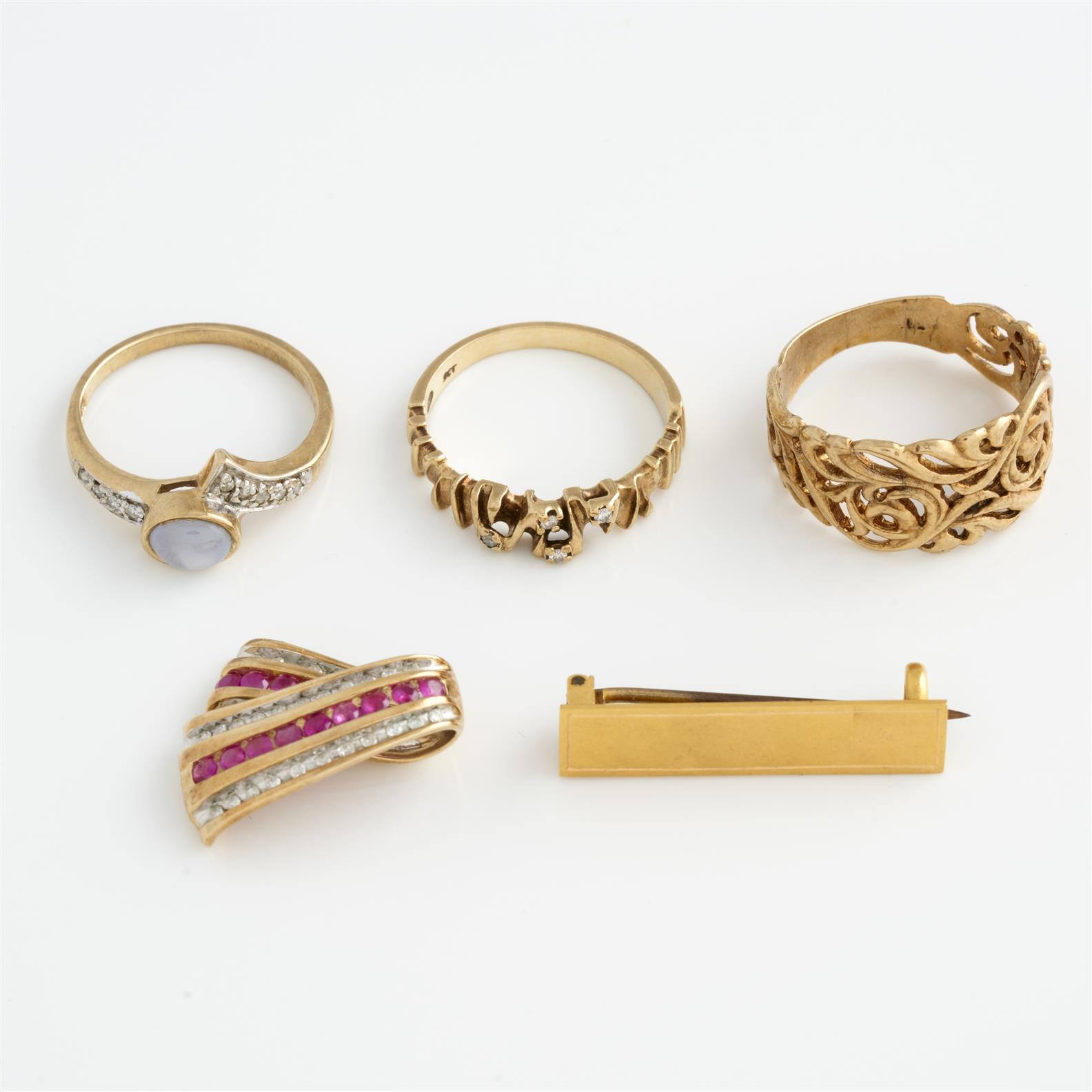 A COLLECTION OF JEWELLERY IN 9CT GOLD, INCLUDING A GEM-SET PENDANT, A BROOCH, AND THREE RINGS, TWO DETAILED WITH DIAMONDS, SIZES N-Q, 16.1GMS