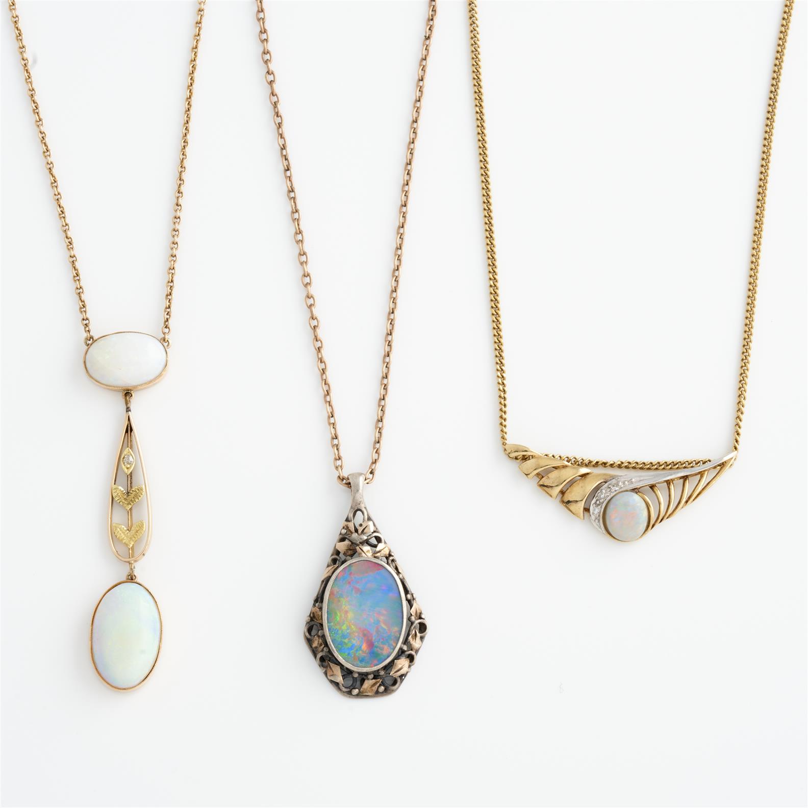 THREE NECKLACE WITH OPAL PENDANTS IN 9CT AND LOW KARAT GOLD, THE ROUND BELCHER AND CURB CHAINS TO SPRING RING AND HOOK CLASPS , 500MM, 380MM, 420MM, 20.7GMS