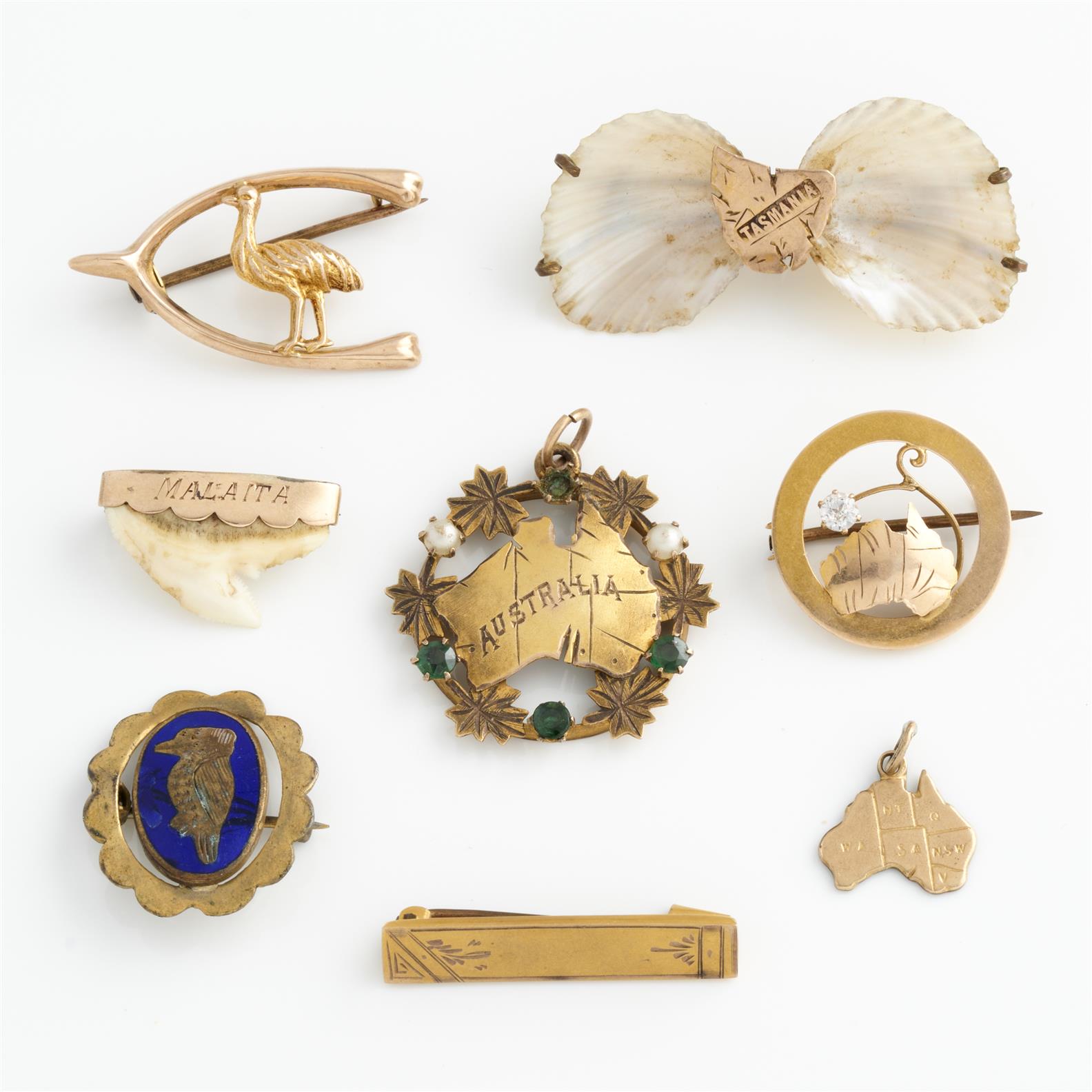 A COLLECTION OF ANTIQUE AUSTRALIAN JEWELLERY INCLUDING SEVEN BROOCHES AND A PENDANT, SOME IN 9CT GOLD, 16.3GMS