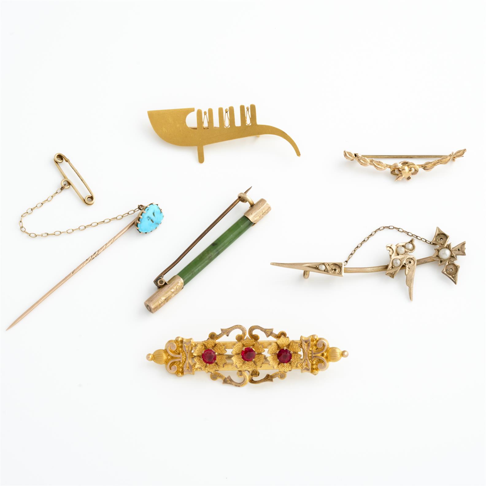 A COLLECTION OF SIX BROOCHES/STICK PINS IN 9CT GOLD, SOME GEM AND PEARL SET, 15.1GMS, A/F (SOME PEARLS DEFICIENT)