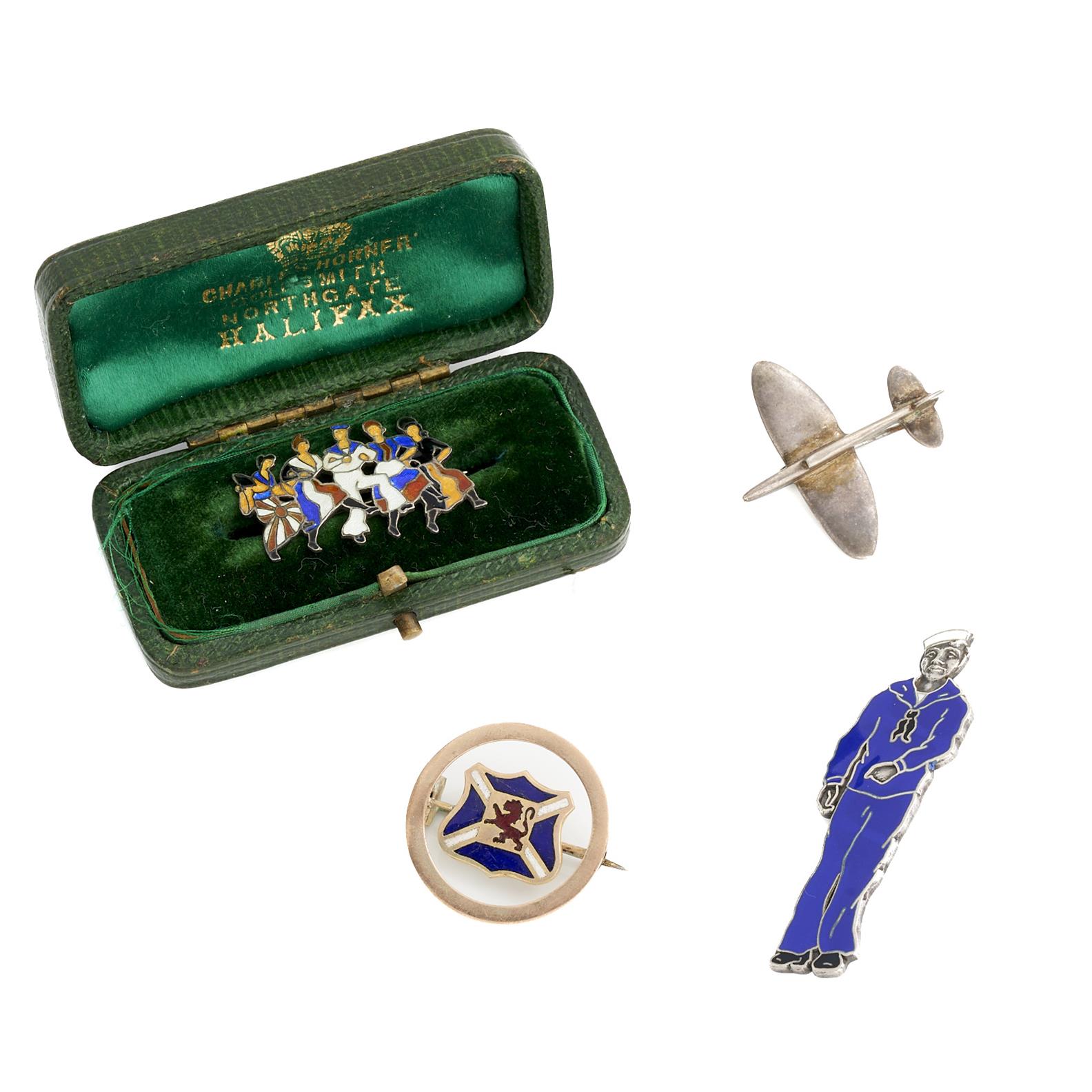 AN ENAMEL WWII VICTORY BROOCH IN STERLING SILVER, TOGETHER WITH A VINTAGE ENAMEL SAILOR BROOCH IN STERLING SILVER AND AEROPLANE BROOCH IN STERLING SILVER