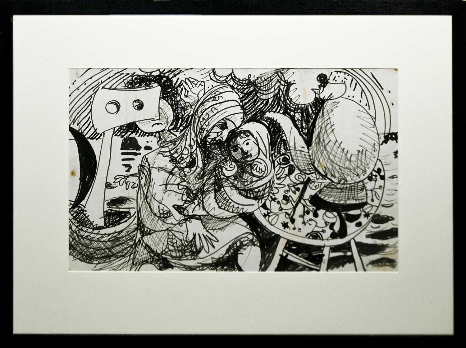 There are multiple areas of staining. Upon inspection, the sheet looks to be adhered to a backing board, revealing air bubbles to the left segment of the sheet. There is a loss to the upper right corner. Overall frame measures 71.5 x 95cm