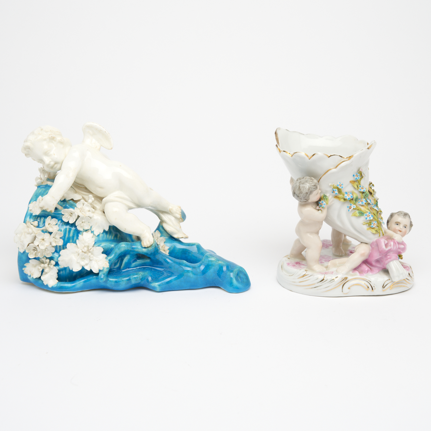 A GOODE PORCELAIN WALL VASE WITH CHERUB MOTIF TOGETHER WITH CAPODIMONTE VASE (A/F)