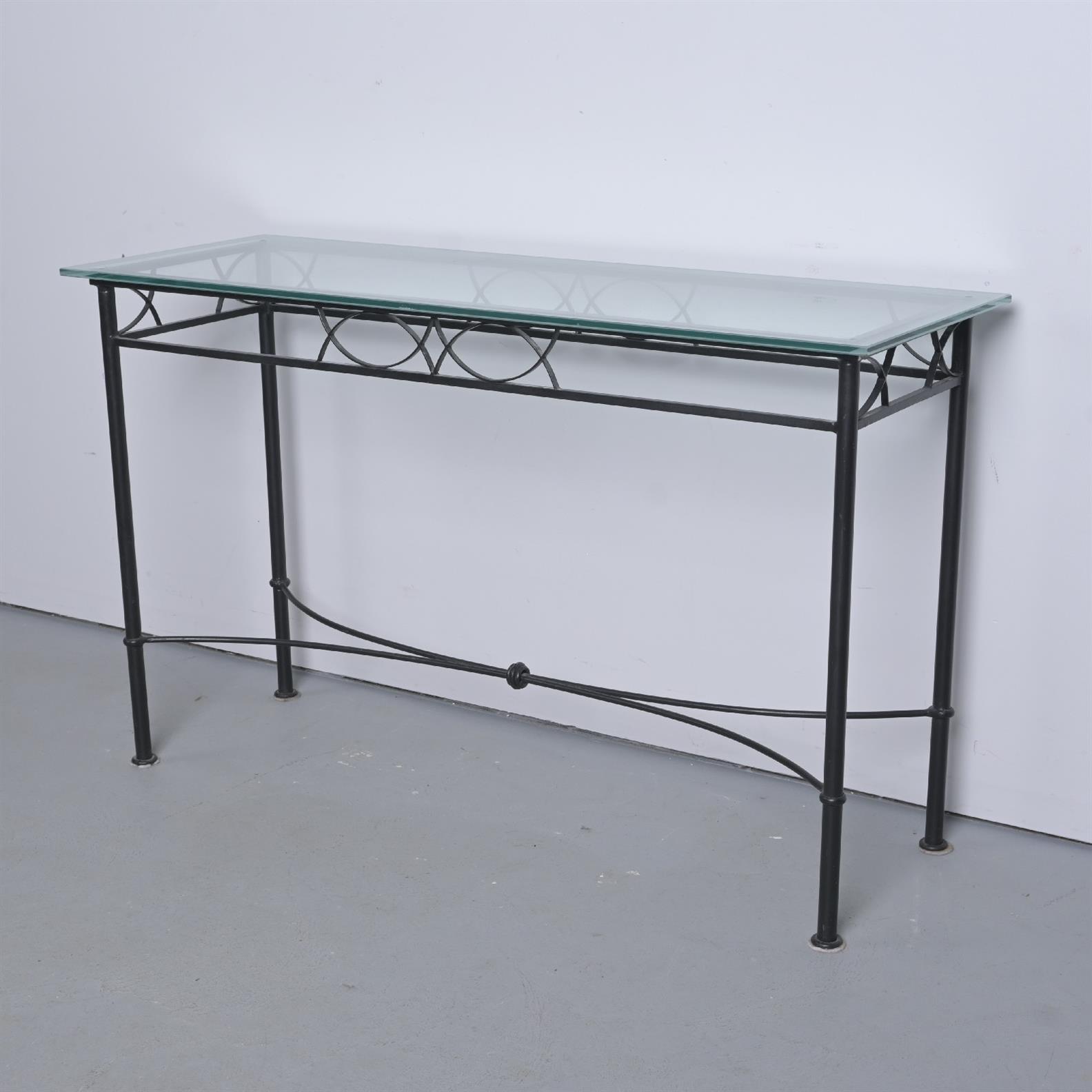 A WROUGHT IRON AND GLASS SIDE TABLE (80H X 132W X 47D CM) (LEONARD JOEL DELIVERY SIZE: X-LARGE)