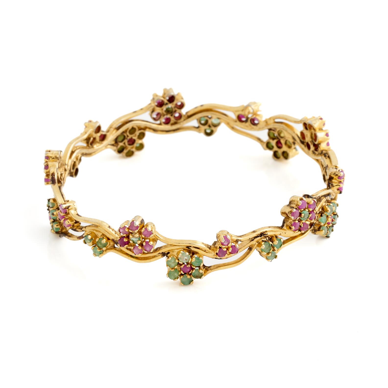 AN EMERALD AND RUBY BANGLE IN GOLD PLATE, INNER DIAMETER 57MM