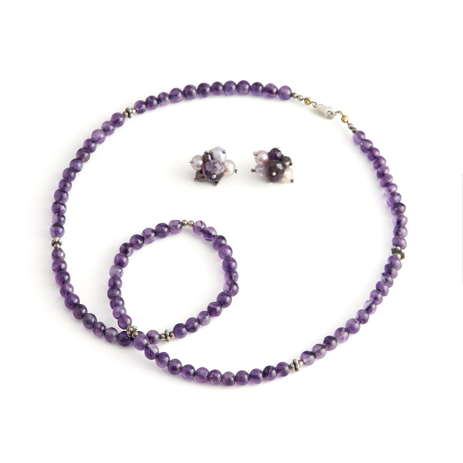 A STRAND OF AMETHYST BEADS, 640MM, TOGETHER WITH A PAIR OF FRESHWATER PEARL AND AMETHYST EARRINGS IN SILVER, TO POST AND BUTTERFLY FITTINGS