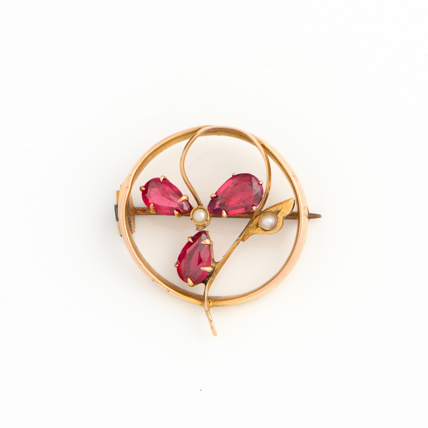 AN ANTIQUE GARNET TOPPED DOUBLE AND SEED PEARL BROOCH IN 9CT GOLD, DIAMETER 24MM