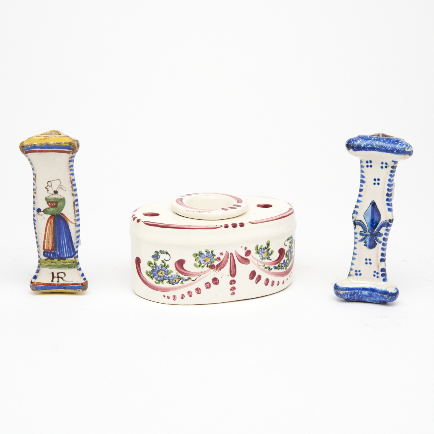 TWO QUIMPER FAIENCE KNIFE RESTS TOGETHER WITH A FAIENCE INKWELL