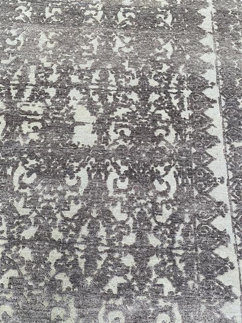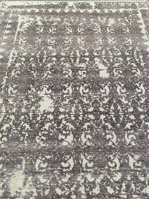 A NEW CONTEMPORARY TRANSITIONAL WOOLEN AND TENCIL SILK RUG. WITH DISTRESSED EMBOSSED PATTERNS IN CARAMEL WITHIN A CREAM BACKGROUND. ORIGIN: JAIPUR (308 X 240 CM) (PLEASE NOTE THERE MAY BE SOME COLOUR VARIATION FROM PHOTOGRAPH)