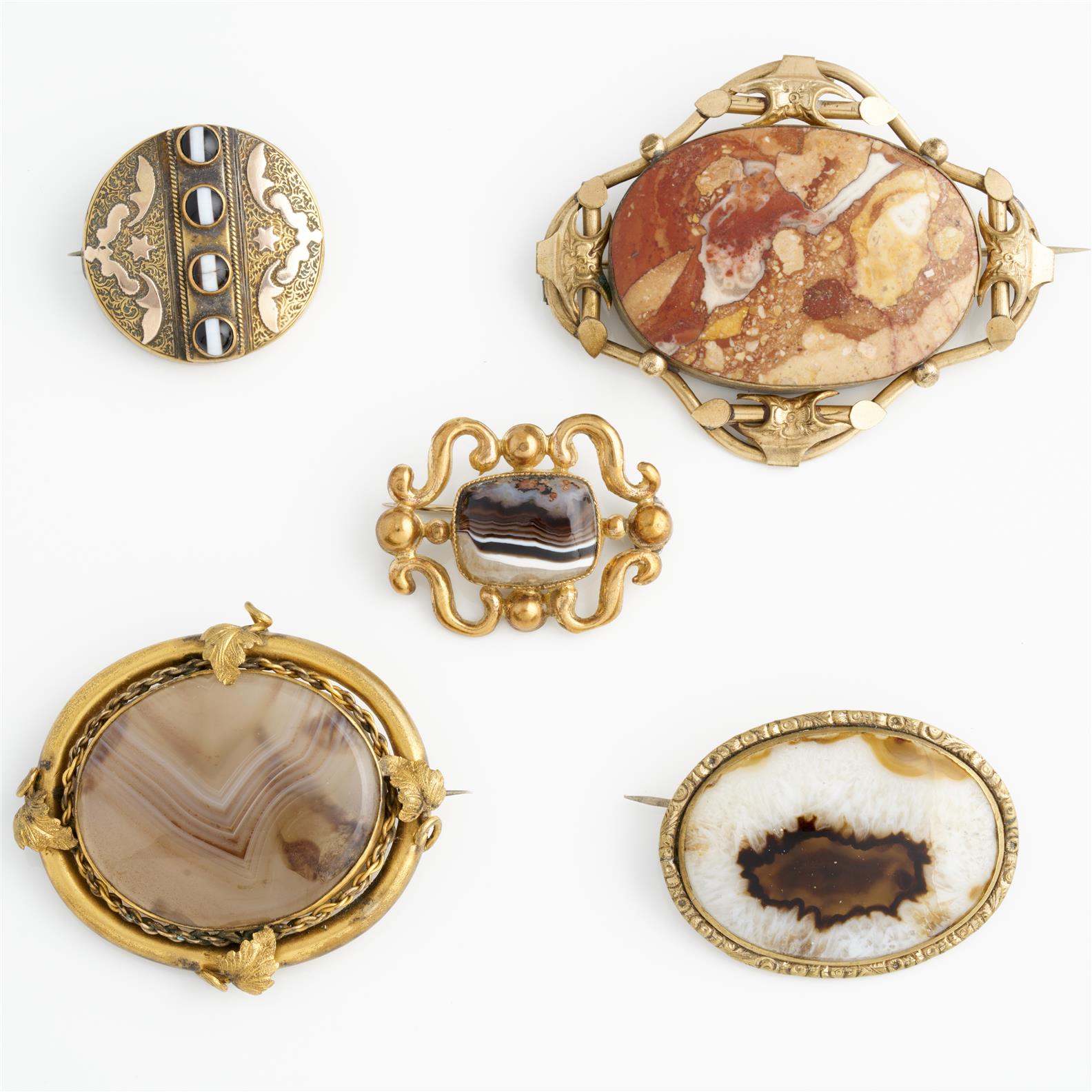 A COLLECTION OF FIVE AGATE SPECIMEN BROOCHES IN GOLD PLATE