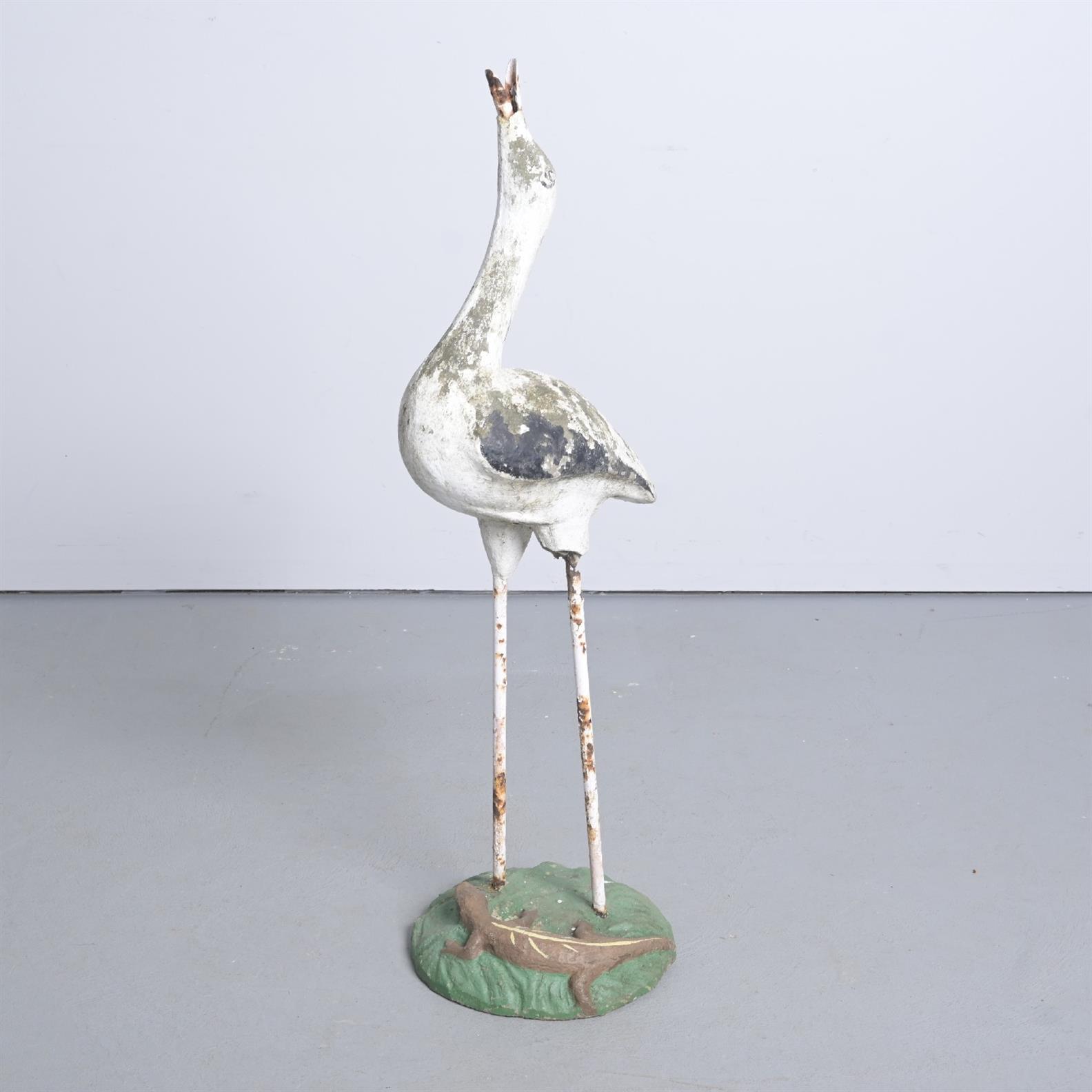 A MID-CENTURY AUSTRALIAN PAINTED CONCRETE AND METAL LEGGED STORK FIGURE ON LIZARD BASE (113HX 36DIA CM) (THIS ITEM MUST BE REMOVED BY CARRIERS AT THE CUSTOMER'S EXPENSE. LEONARD JOEL STAFF CANNOT ASSIST CARRYING THIS ITEM)