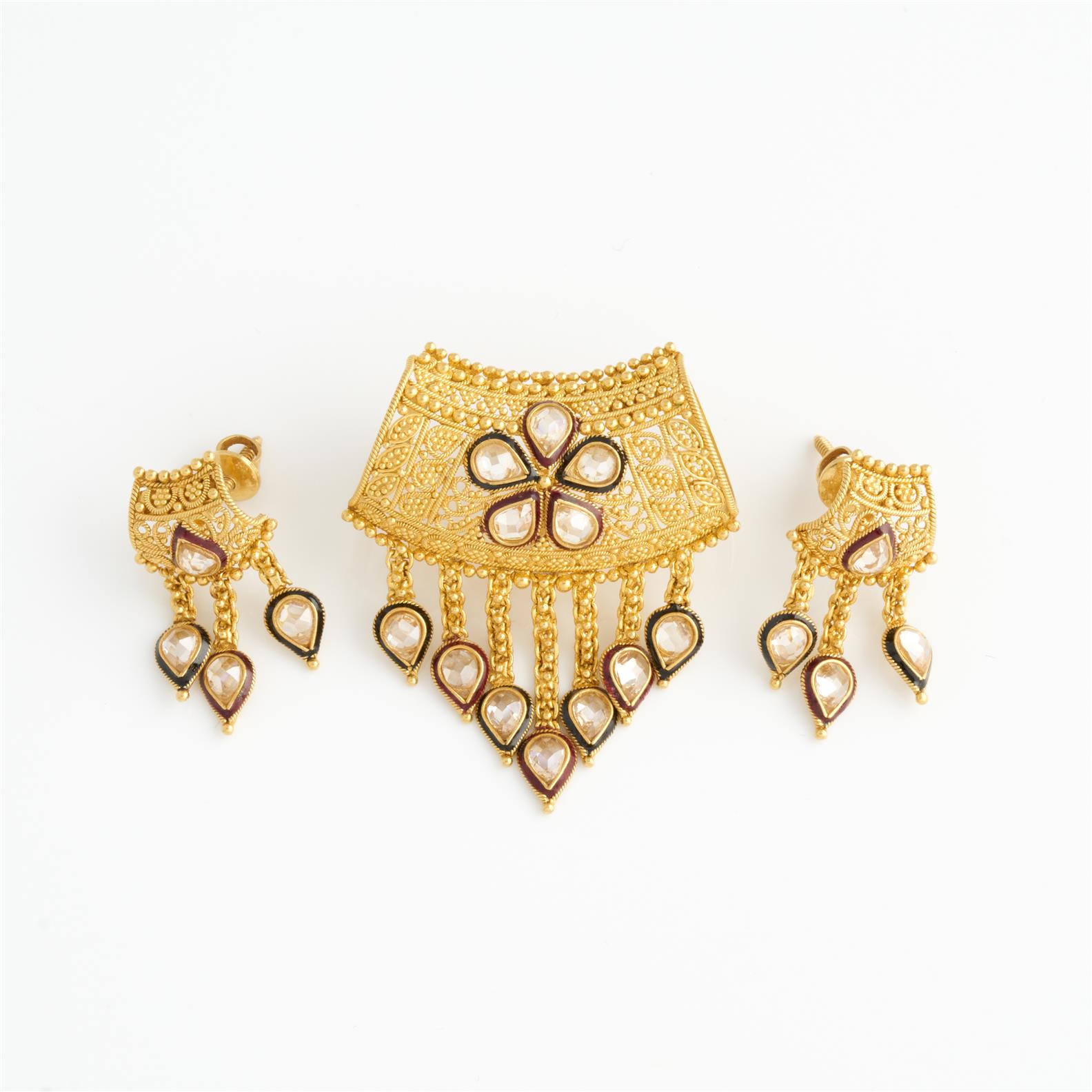 A GEM AND ENAMEL SUITE IN 20CT GOLD, INCLUDING EARRINGS TO POST AND SCREWBACK FITTINGS, LENGTH 20MM, AND A PENDANT, 30 X 35MM, SUSPENDED FROM A METAL NECKLACE, THE EARRINGS AND PENDANT WEIGHING 17GMS