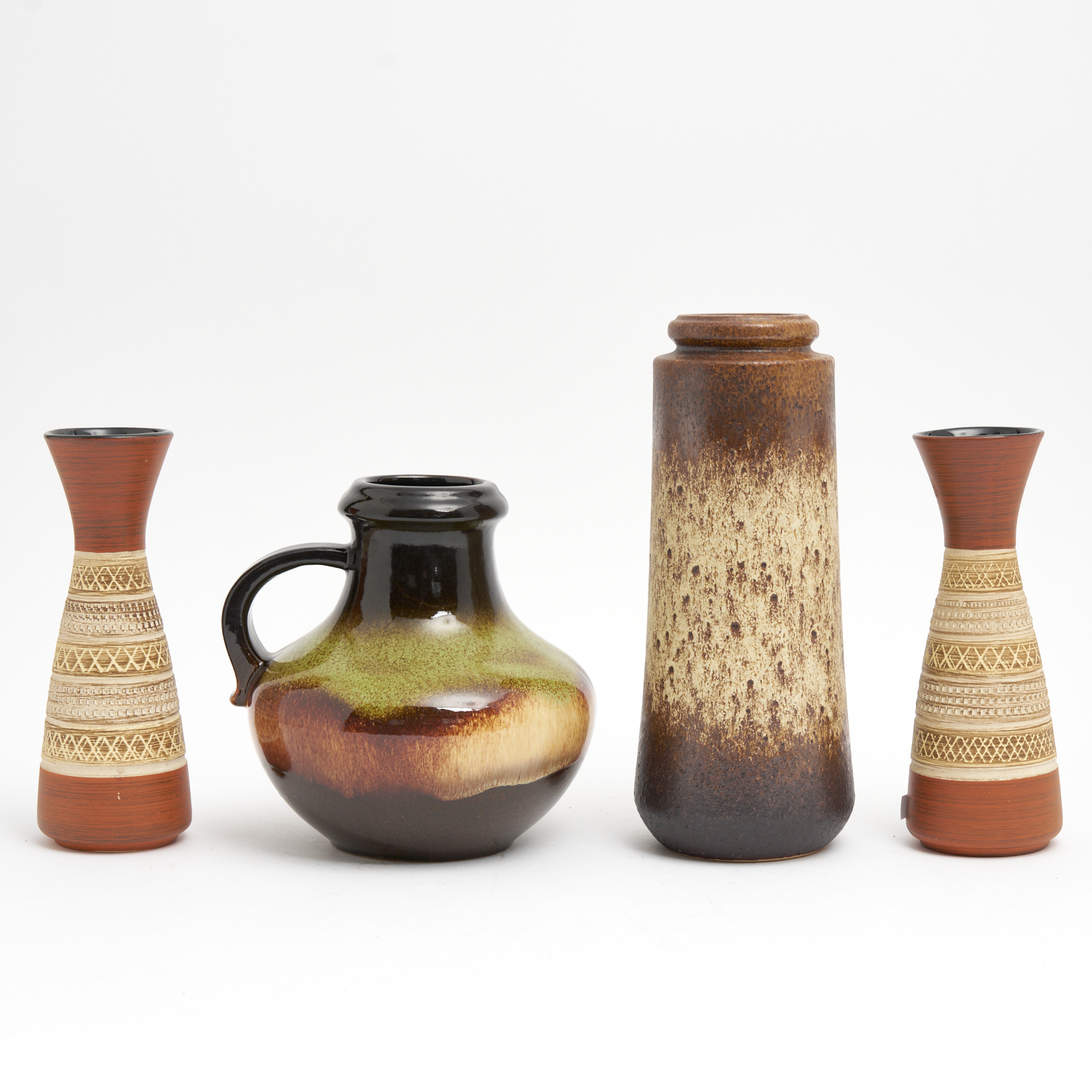 A COLLECTION OF FOUR MID-CENTURY GERMAN GLAZED POTTERY VASES H.27CM (TALLEST), LEONARD JOEL DELIVERY SIZE: MEDIUM