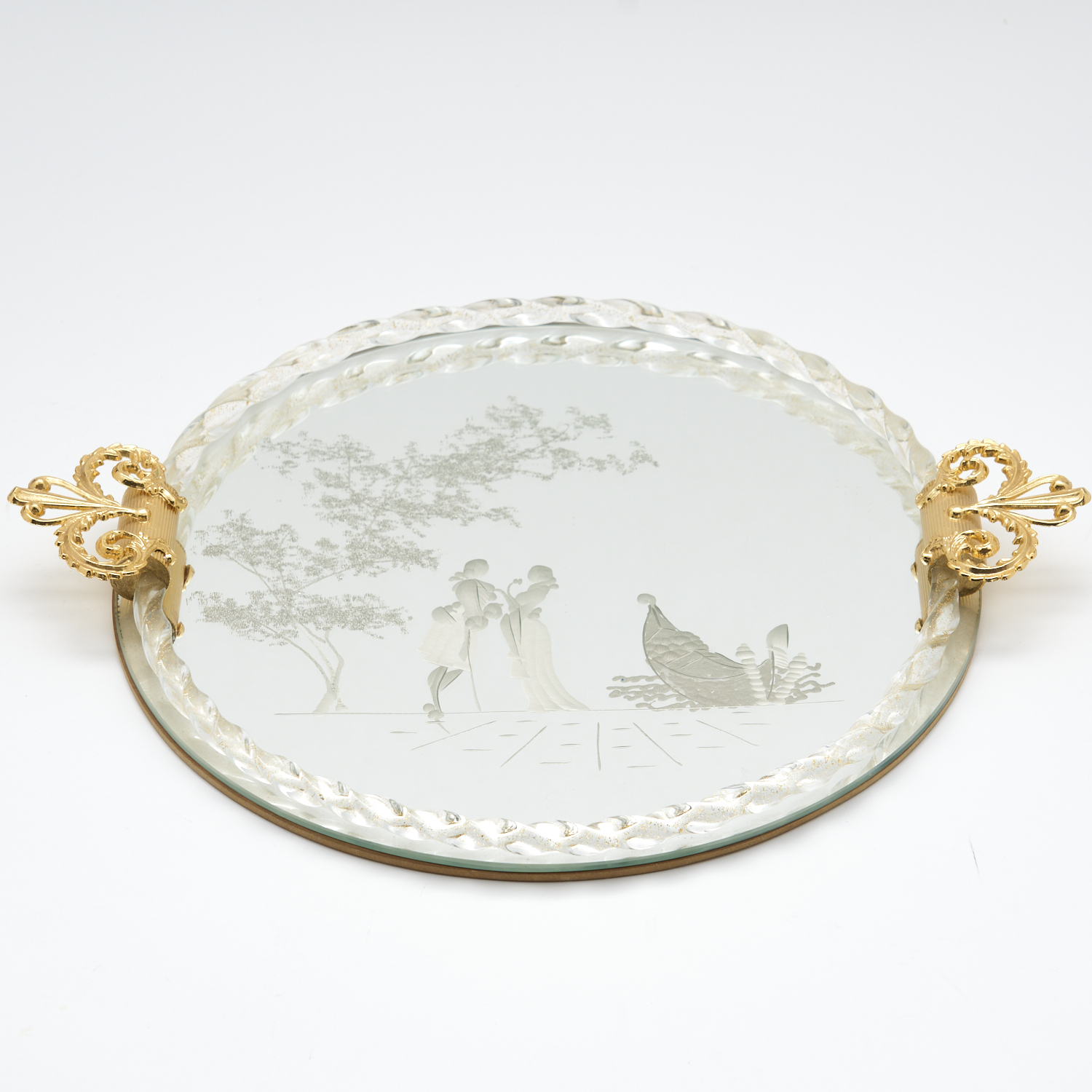 A MID-CENTURY ITALIAN ETCHED AND MIRROR BASED CIRCULAR TRAY WITH GILDED METAL HANDLES AND TWISTED GLASS BORDER DIA.37CM, LEONARD JOEL DELIVERY SIZE: MEDIUM