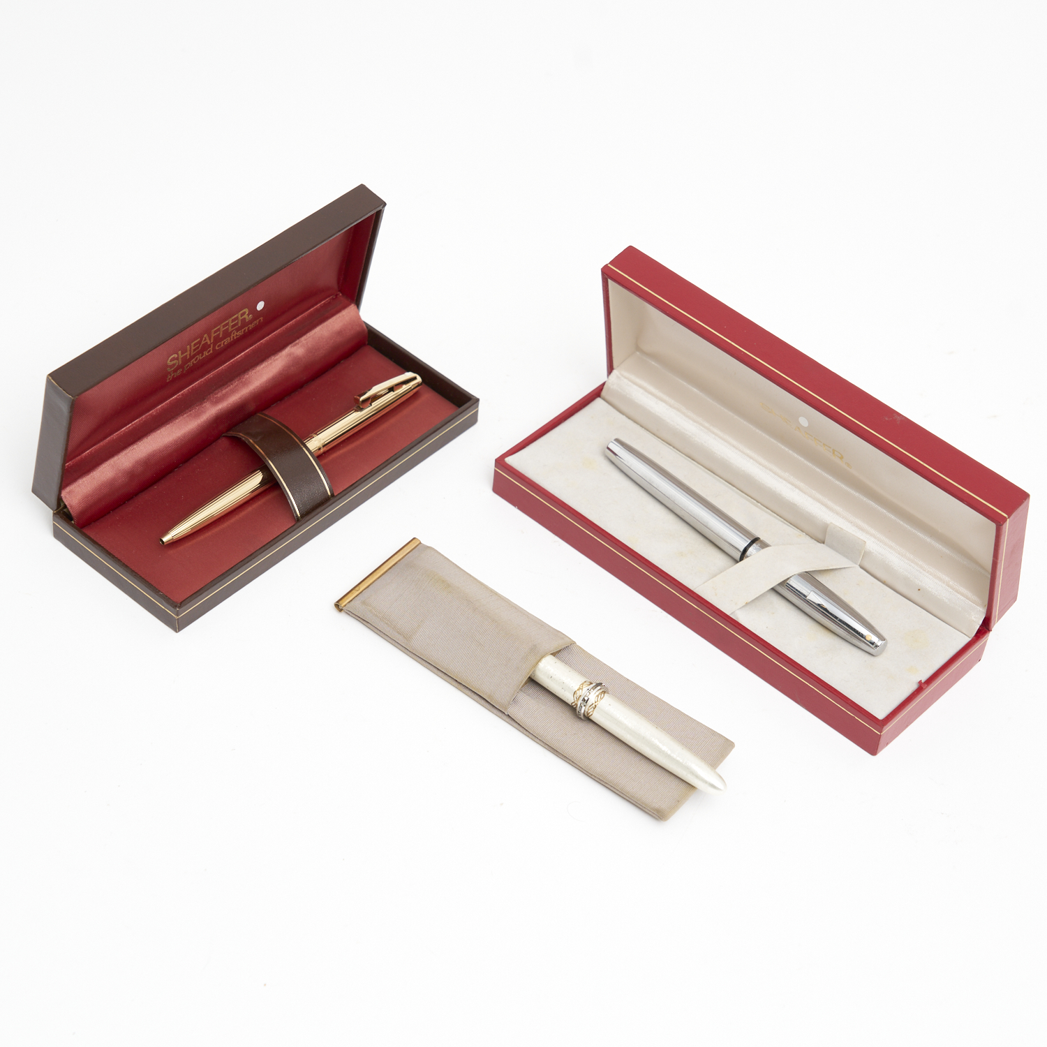 A GROUP OF THREE BOXED SCHAEFFER FOUNTAIN PENS WITH 14 CARAT GOLD NIBS. LEONARD JOEL DELIVERY SIZE: SMALL