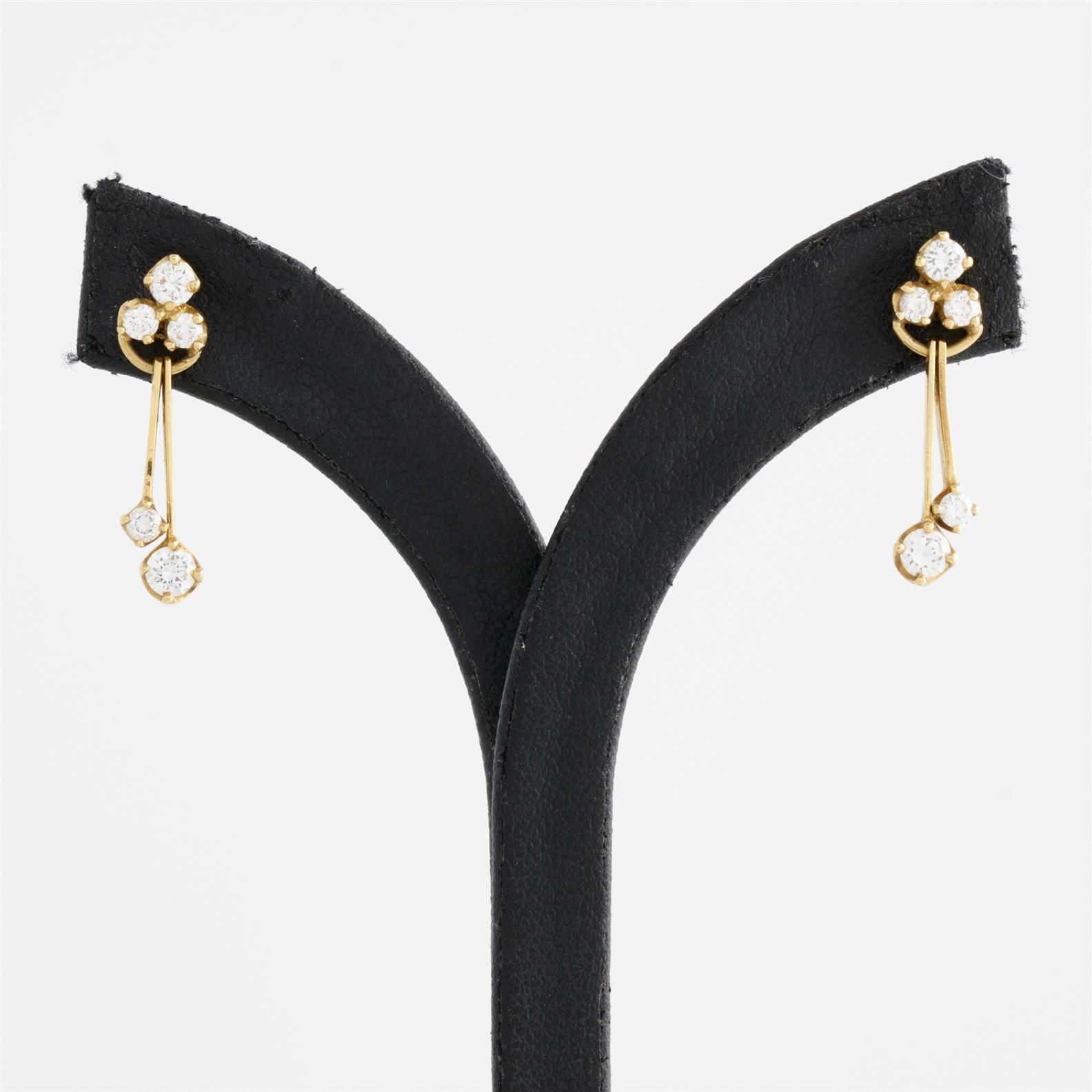 A PAIR OF DIAMOND DROP EARRINGS IN 18CT GOLD, THE DIAMONDS TOTALLING 0.65CTS, TO POST AND BUTTERFLY FITTINGS, LENGTH 22MM, 2.2GMS