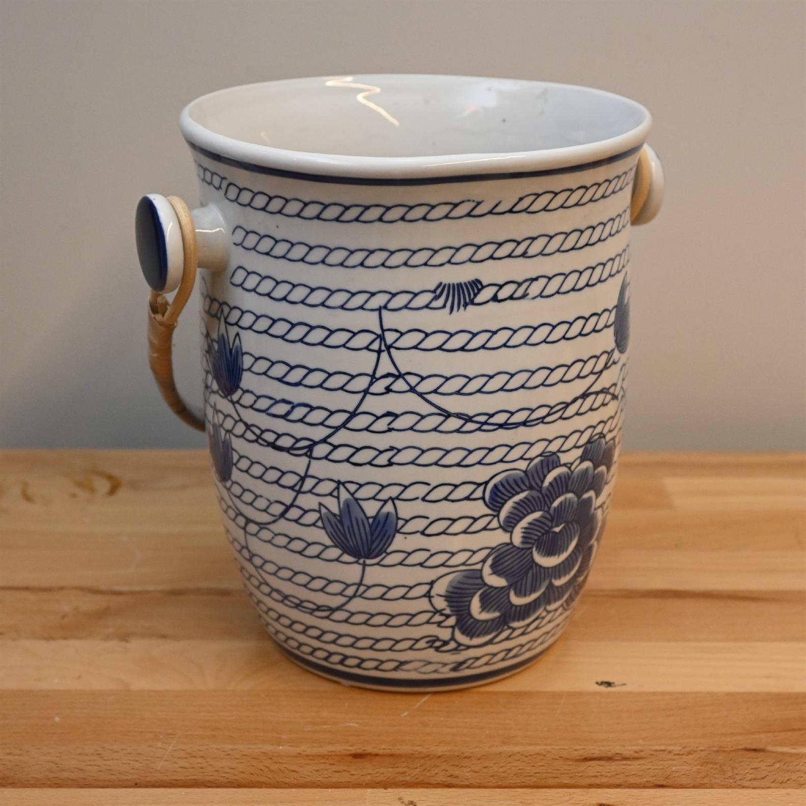 A BLUE AND WHITE CERAMIC VASE WITH HANDLE(28HX 30W X 24D CM) (LEONARD JOEL DELIVERY: MEDIUM)
