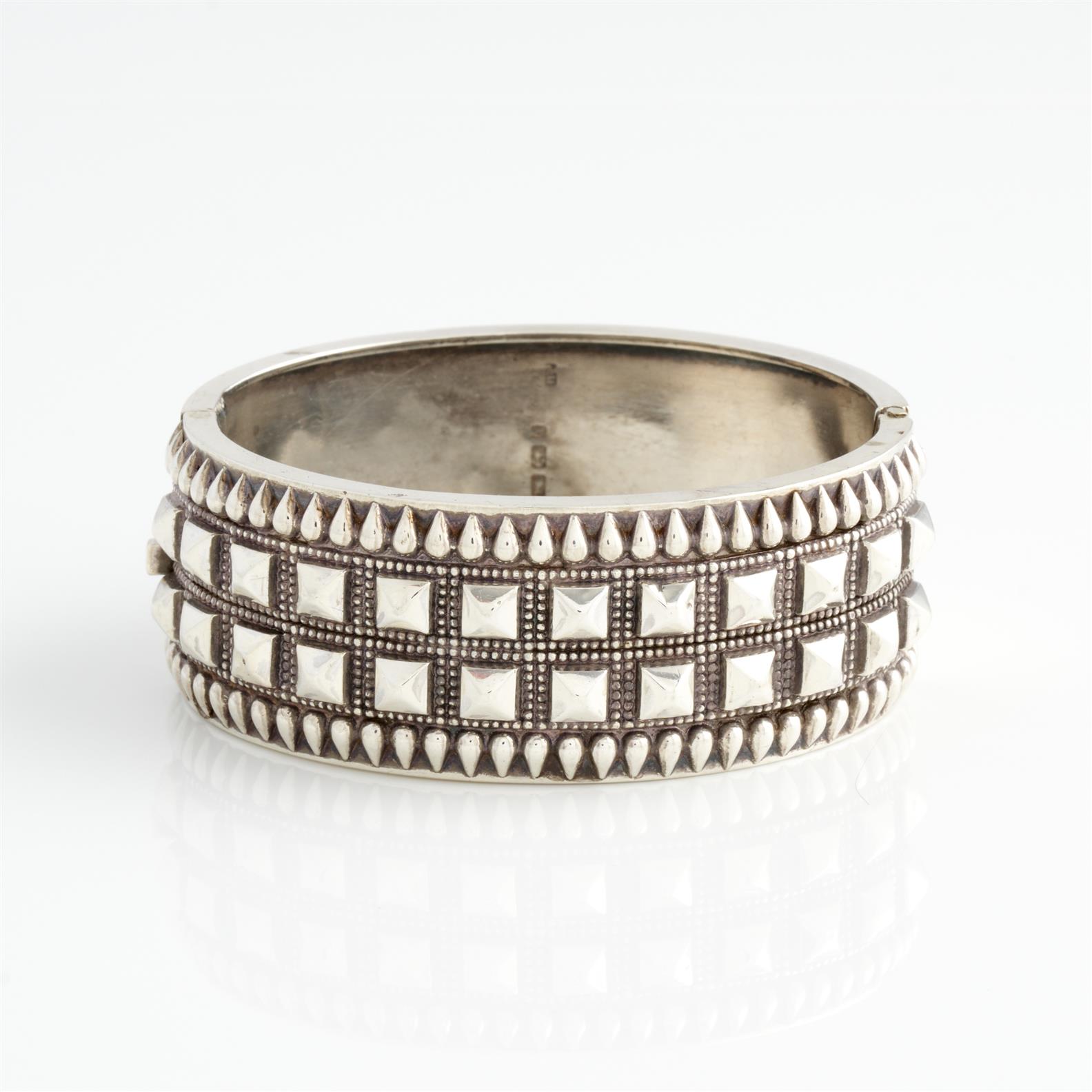 A BRUTALIST BANGLE IN SILVER, INNER DIAMETER 57MM, WIDTH 25MM, BIRMINGHAM HALLMARKS CIRCA 1882