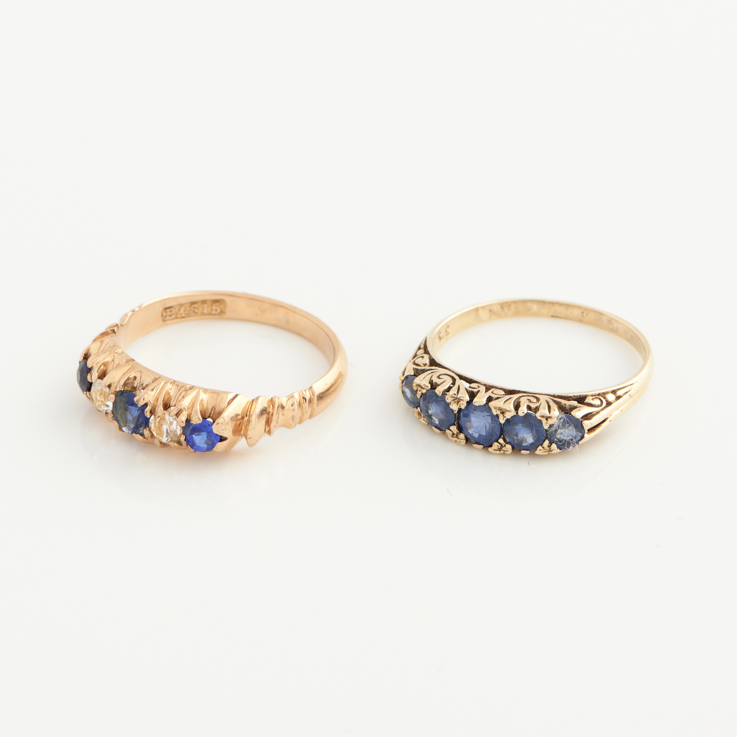 A BLUE GEM AND DIAMOND RING IN 15CT GOLD, TOGETHER WITH A SAPPHIRE RING IN 9CT GOLD, SIZE L AND M 1/2, 5.0GMS
