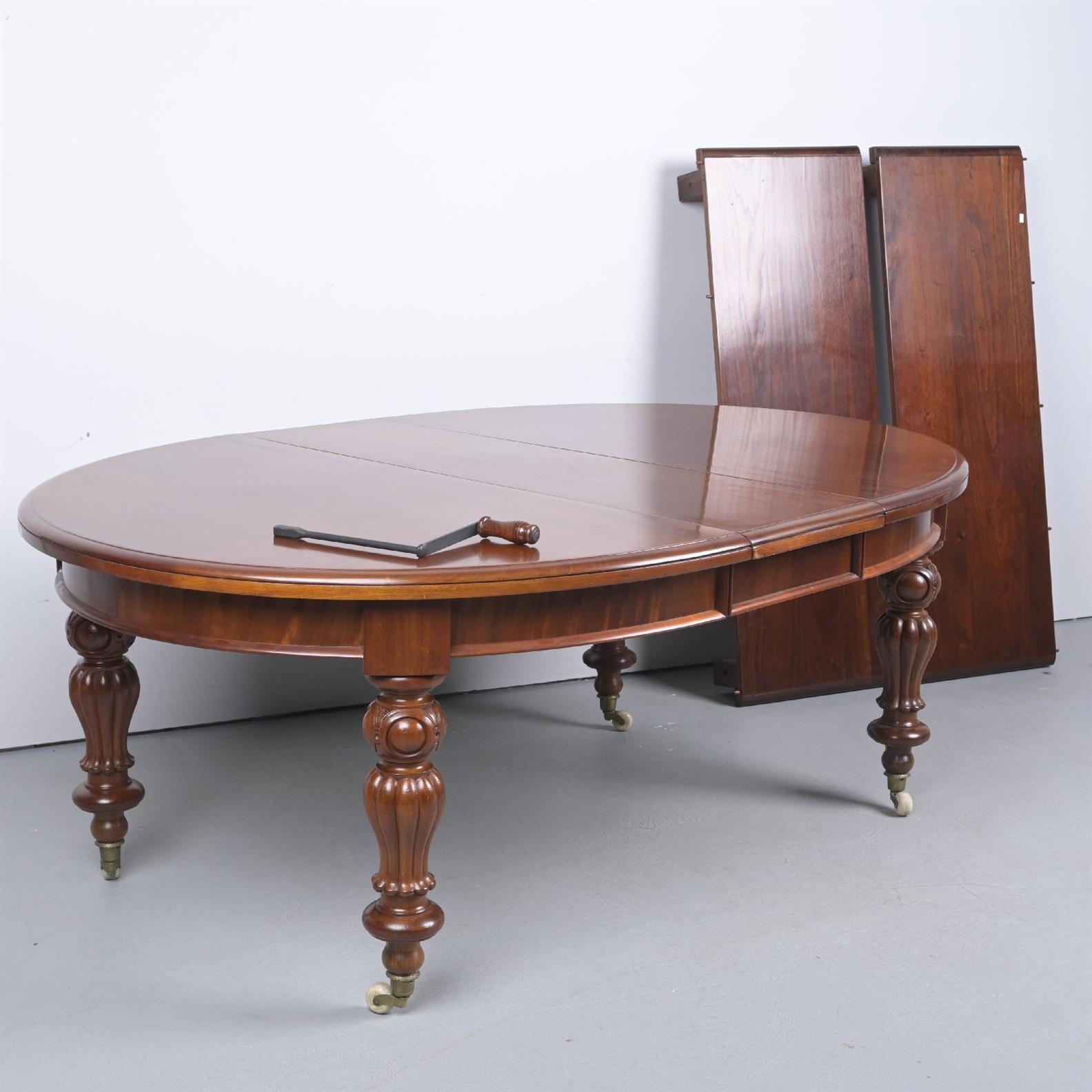 A VICTORIAN MAHOGANY EXTENDING DINING TABLE, WITH THREE SPARE LEAVES (78H X 164W UNEXTENDED X 140D CM; 290W EXTENDED) (THIS ITEM MUST BE REMOVED BY CARRIERS AT THE CUSTOMER'S EXPENSE. LEONARD JOEL STAFF CANNOT ASSIST CARRYING THIS ITEM)