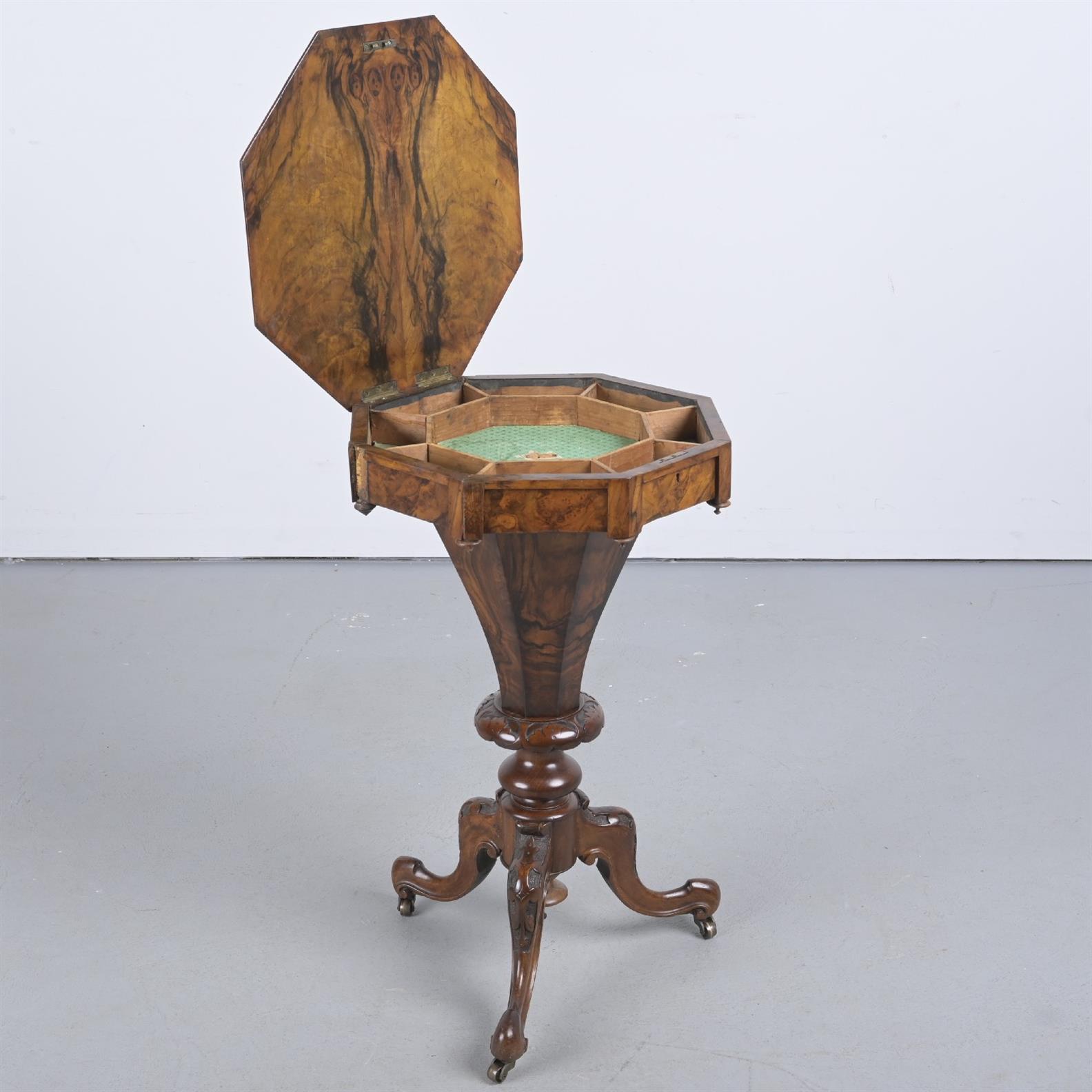 A VICTORIAN FIGURED WALNUT AND INLAID SEWING TABLE. (H73 X D45 CM) (LEONARD JOEL DELIVERY SIZE: LARGE)