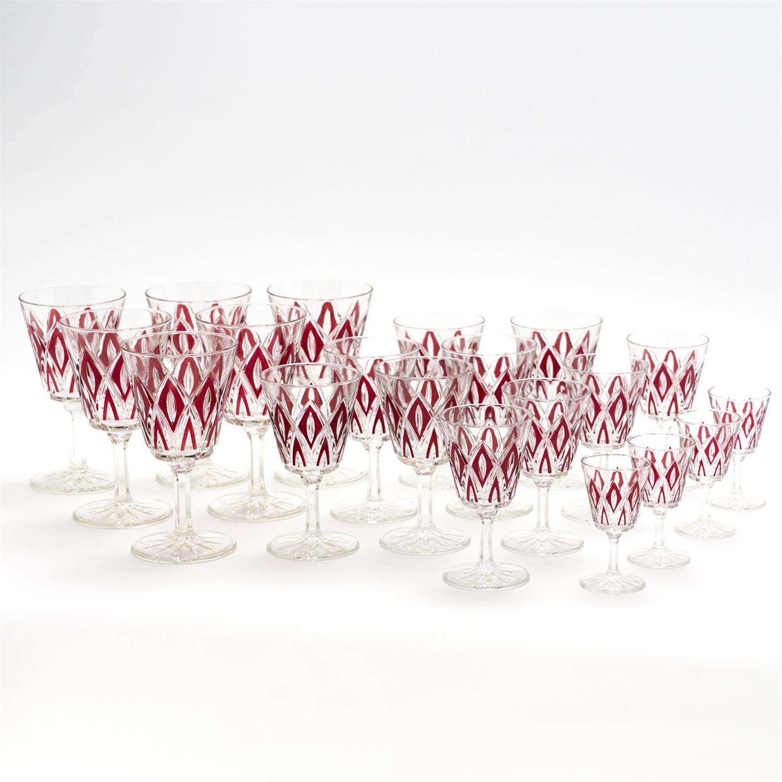 A SUITE OF POSSIBLY VMC REIMS CRYSTAL STEMWARE INCLUDING TWO SETS OF SIX WINES AND TWO SETS OF FOUR SHERRIES (A/F, SOME DAMAGED) H.15CM (TALLEST), LEONARD JOEL DELIVERY SIZE: LARGE
