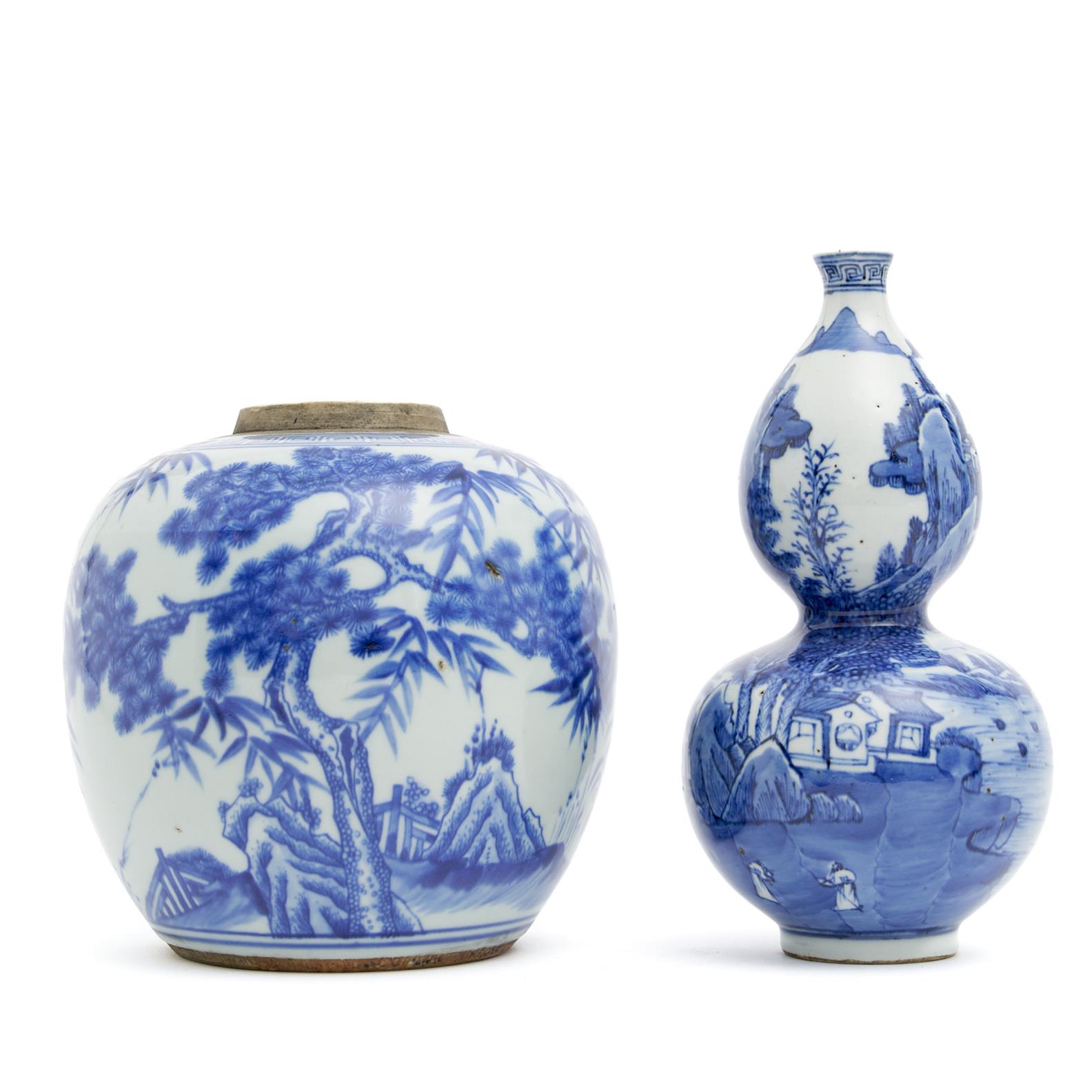 TWO CHINESE BLUE AND WHITE PIECES OF PORCELAIN INCL. GINGER JAR AND GOURD SHAPED VASE H.22CM (TALLEST), LEONARD JOEL DELIVERY SIZE: MEDIUM