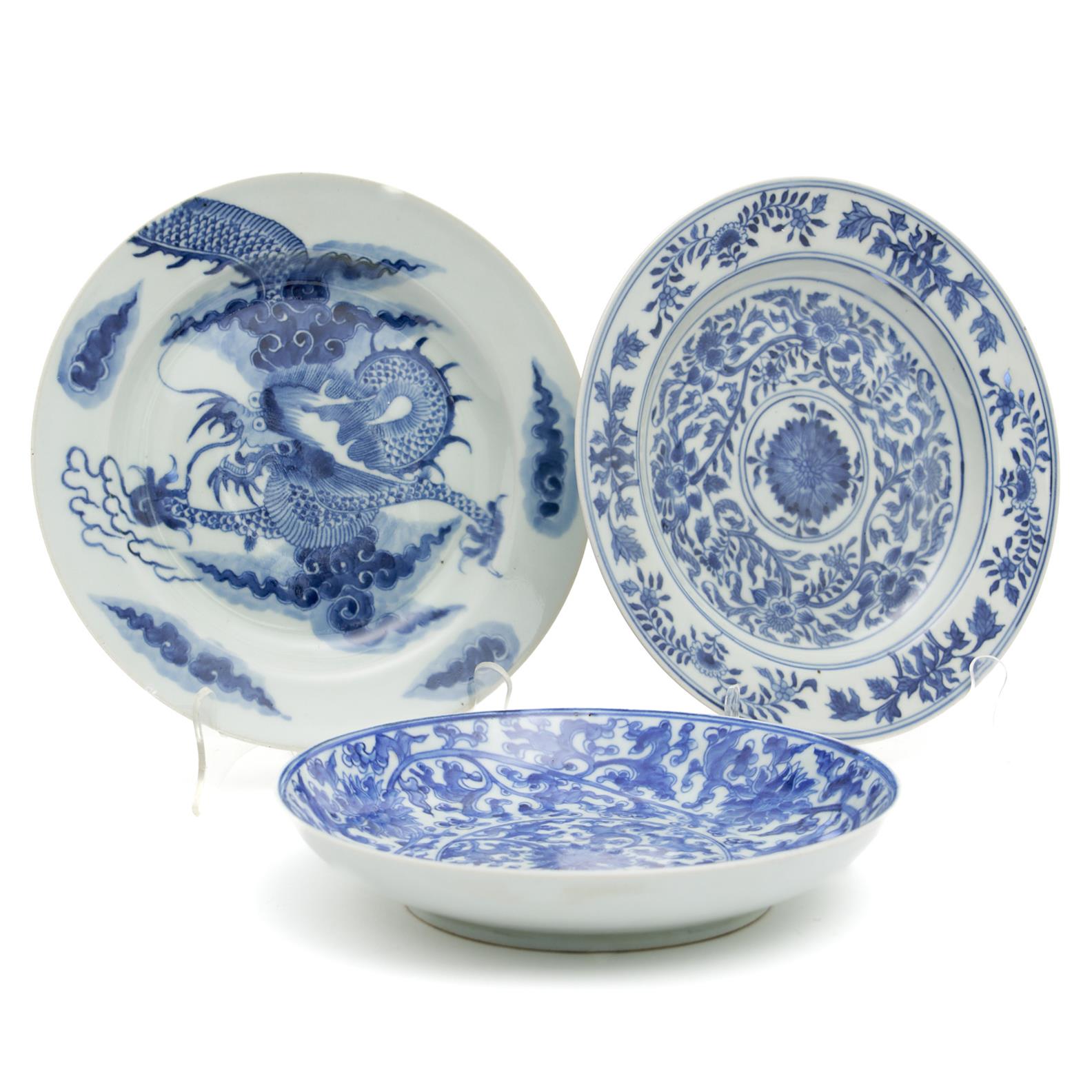 A COLLECTION OF THREE CHINESE BLUE AND WHITE DISHES (A/F) DIA.23CM (WIDEST), LEONARD JOEL DELIVERY SIZE: MEDIUM