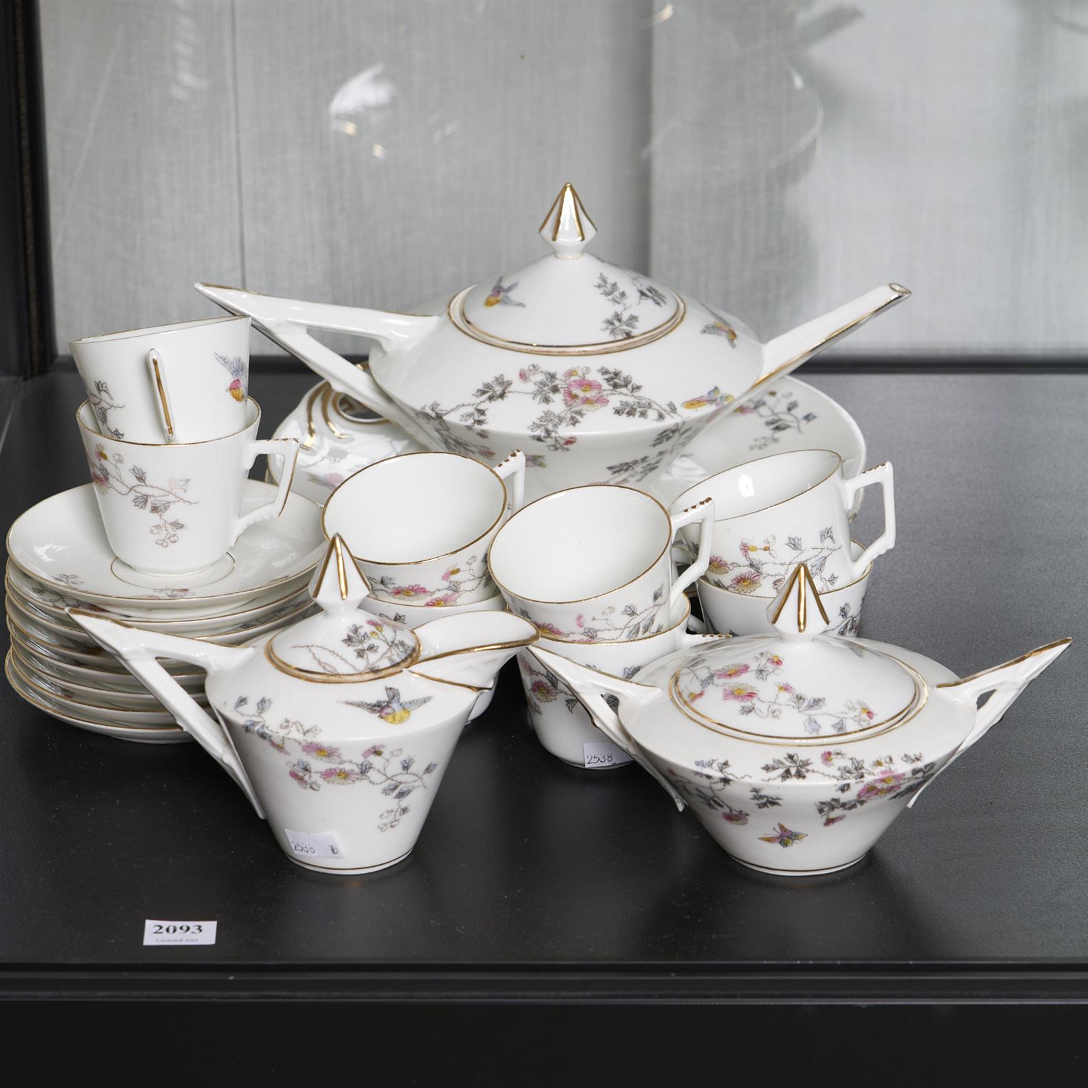 A CONTINENTAL ART DECO TEA SETTING FOR EIGHT INCLUDING A SUGAR BOWL, CREAMER, TEAPOT, TEA CUPS AND SAUCERS, AND TWO CAKE PLATES, DIA.25.5CM, LEONARD JOEL DELIVERY SIZE: LARGE