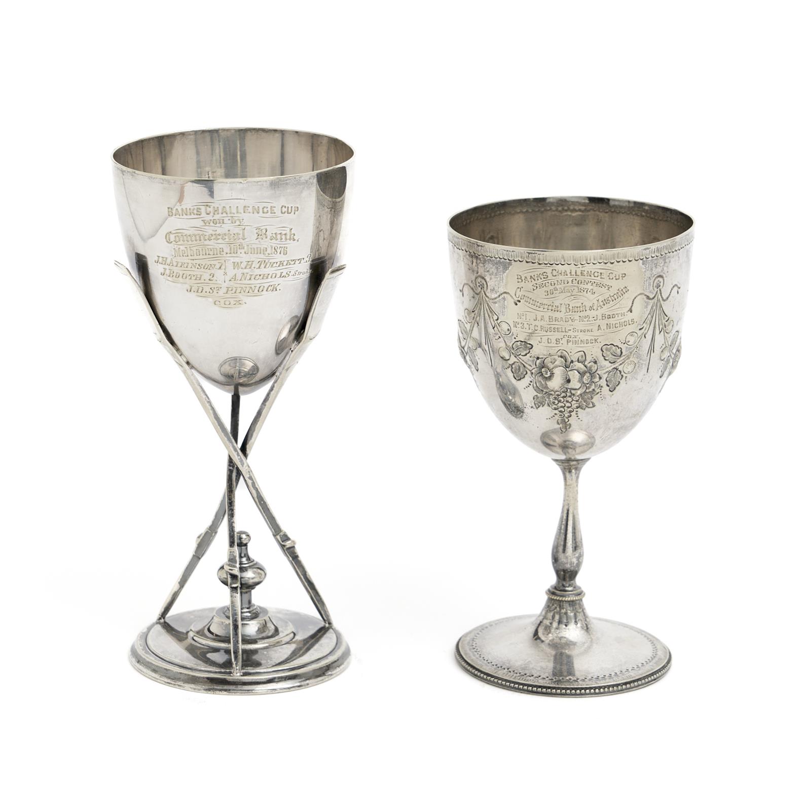 TWO AUSTRALIAN SILVER PLATE ROWING TROPHY CUPS H.17.5CM, LEONARD JOEL DELIVERY SIZE: SMALL