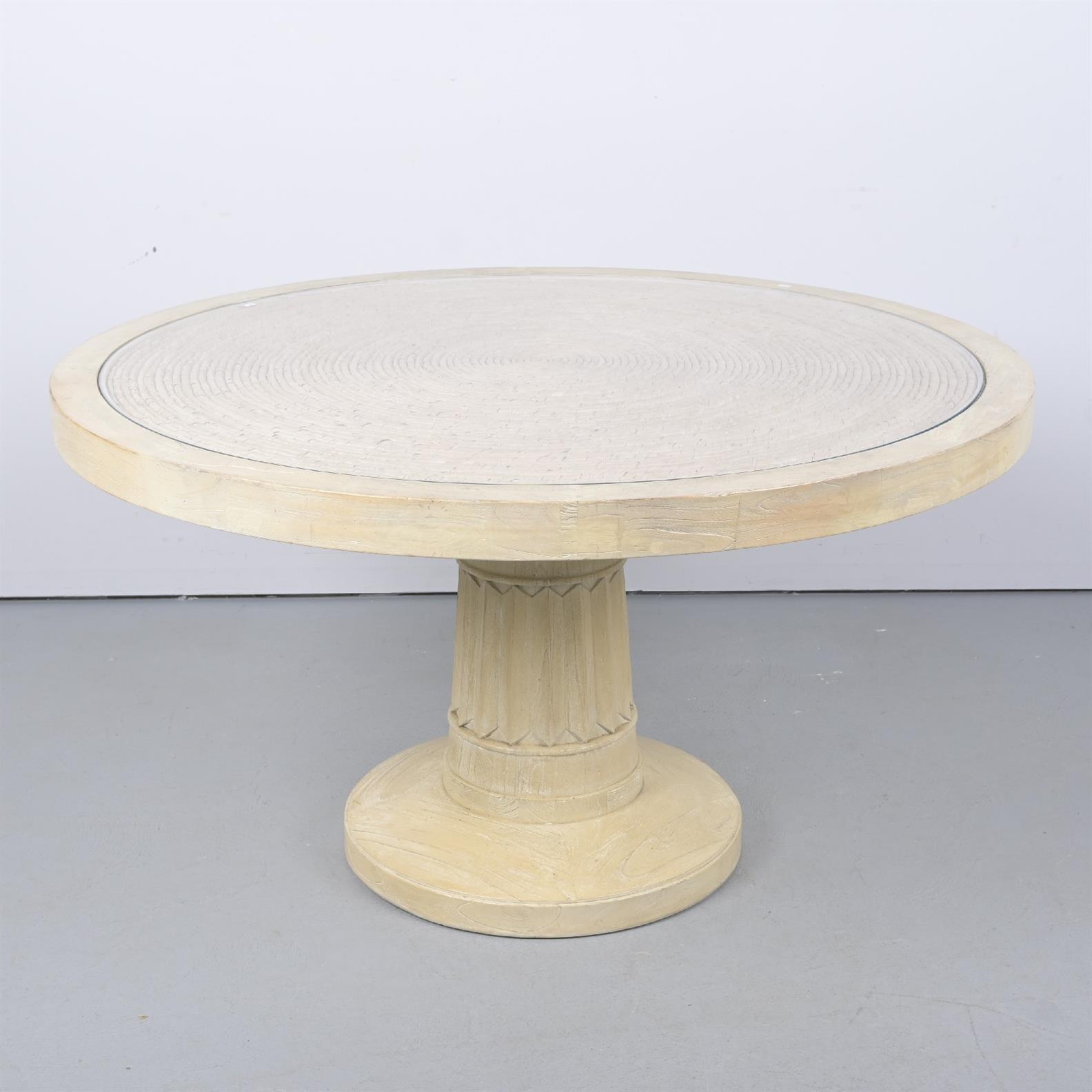 A HARDWOOD PEDESTAL DINING TABLE WITH COILED CANE TOP UNDER GLASS, FOR CROMWELL (77H X 137DIA CM) (THIS ITEM MUST BE REMOVED BY CARRIERS AT THE CUSTOMER'S EXPENSE. LEONARD JOEL STAFF CANNOT ASSIST CARRYING THIS ITEM)