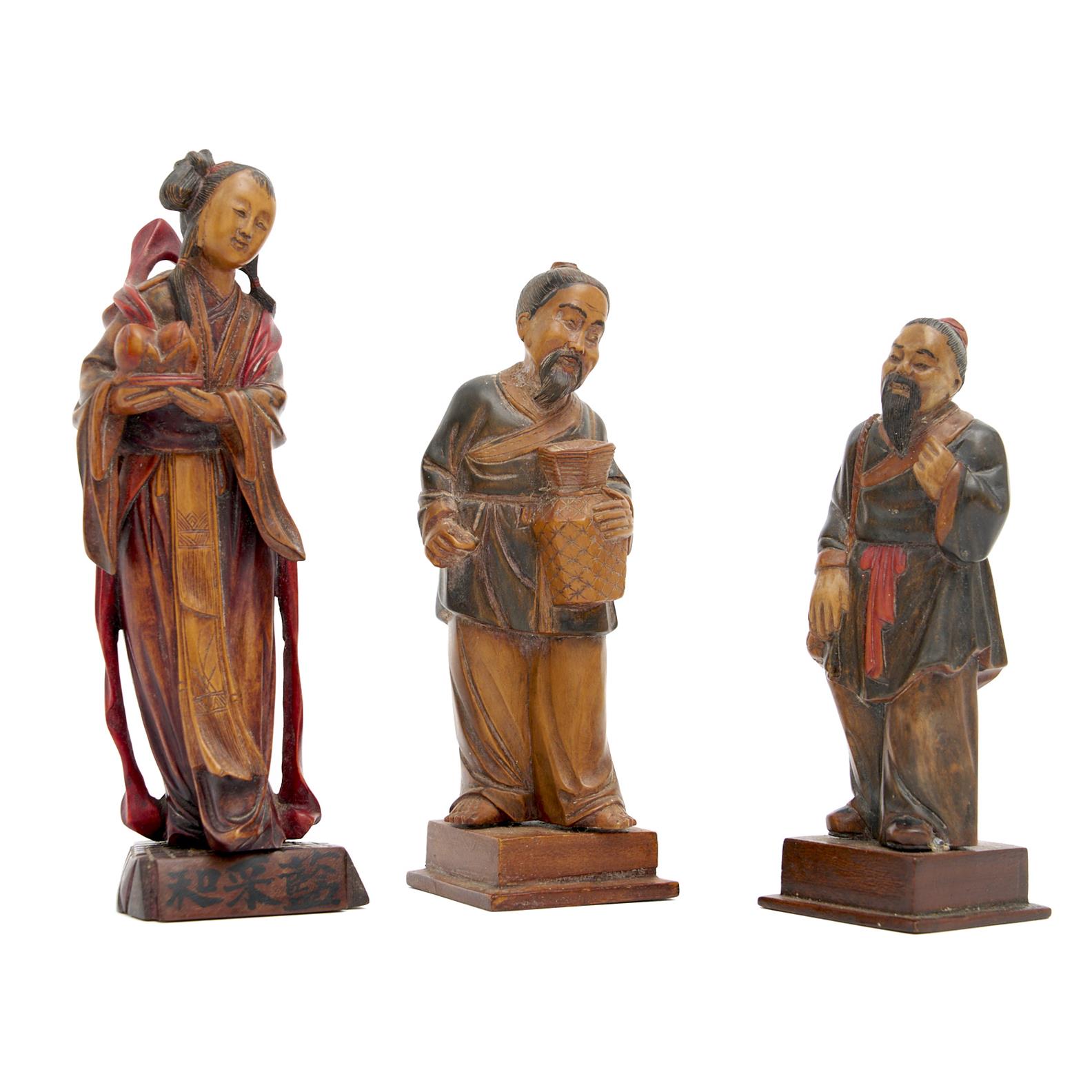 THREE EARLY 20TH CENTURY CHINESE CARVED WOOD FIGURES H.18CM (TALLEST), LEONARD JOEL DELIVERY SIZE: SMALL