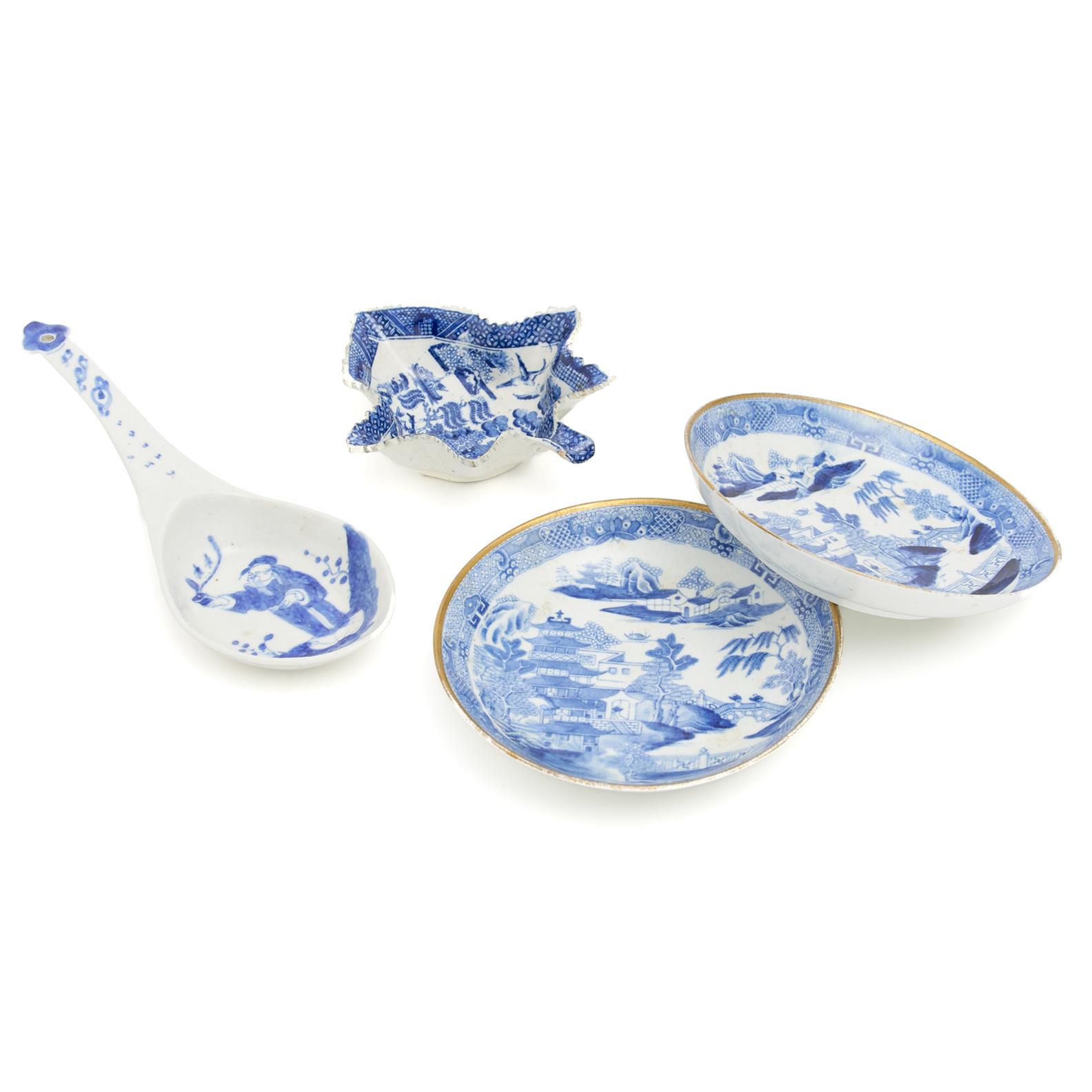 A COLLECTION OF 19TH C. BLUE AND WHITE PORCELAIN INCL. WILLOW PATTERN PICKLE DISH, TWO WILLOW PATTERN PLATES AND A SPOON L.21CM (LONGEST), LEONARD JOEL DELIVERY SIZE: MEDIUM