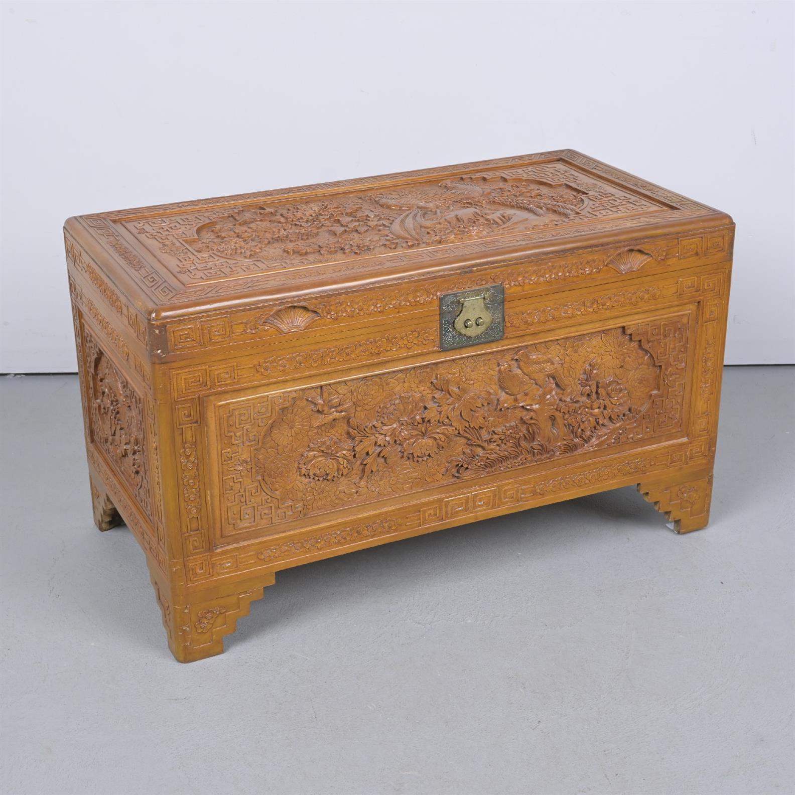 A CHINESE CARVED CAMPHOR WOOD CHEST (60H X 102W X 53D CM) (LEONARD JOEL DELIVERY SIZE: X-LARGE)