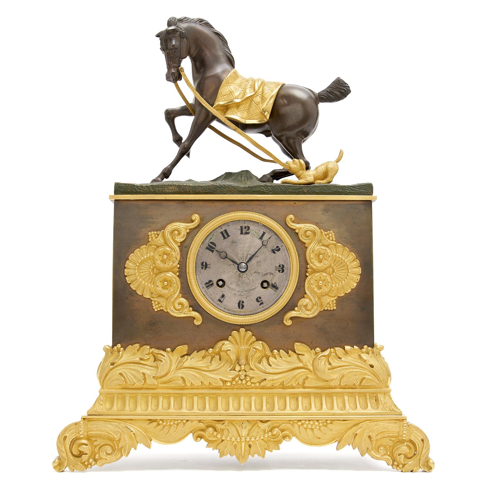 A NAPOLEON III LATE 19TH CENTURY PARCEL GILT BRONZE SILK SUSPENSION MOVEMENT CLOCK SURMOUNTED WITH A HORSE WITH DOG (WITH KEY AND PENDULUM) (A/F, NEEDS A NEW SILK) H.41CM, LEONARD JOEL DELIVERY SIZE: MEDIUM