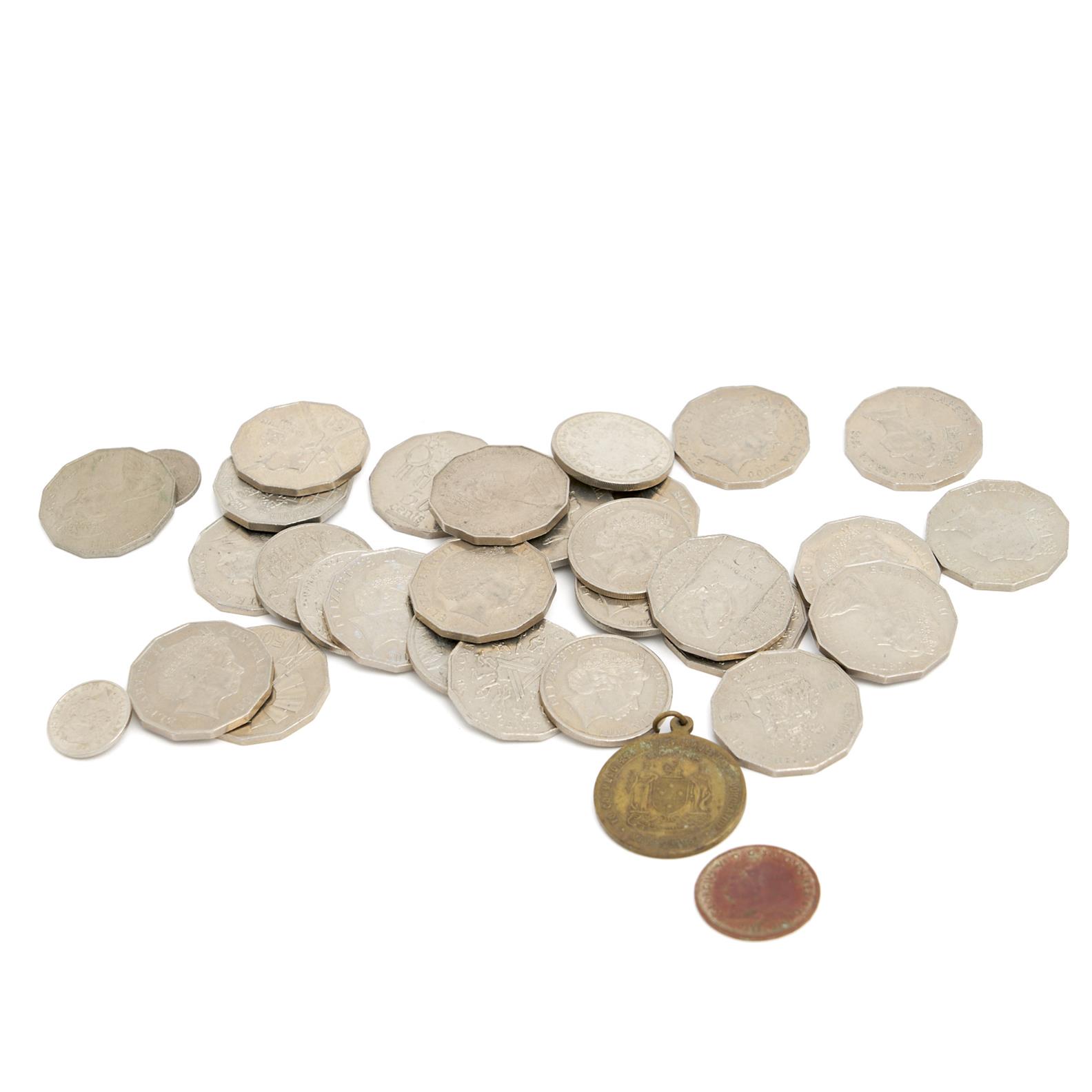 A COLLECTION OF AUSTRALIAN COLLECTABLE FIFTY CENT COINS AND OTHER COINS TOGETHER WITH A CORONATION OF GEORGE VI AND ELIZABETH MEDALION AND A 1943 HALF PENNY