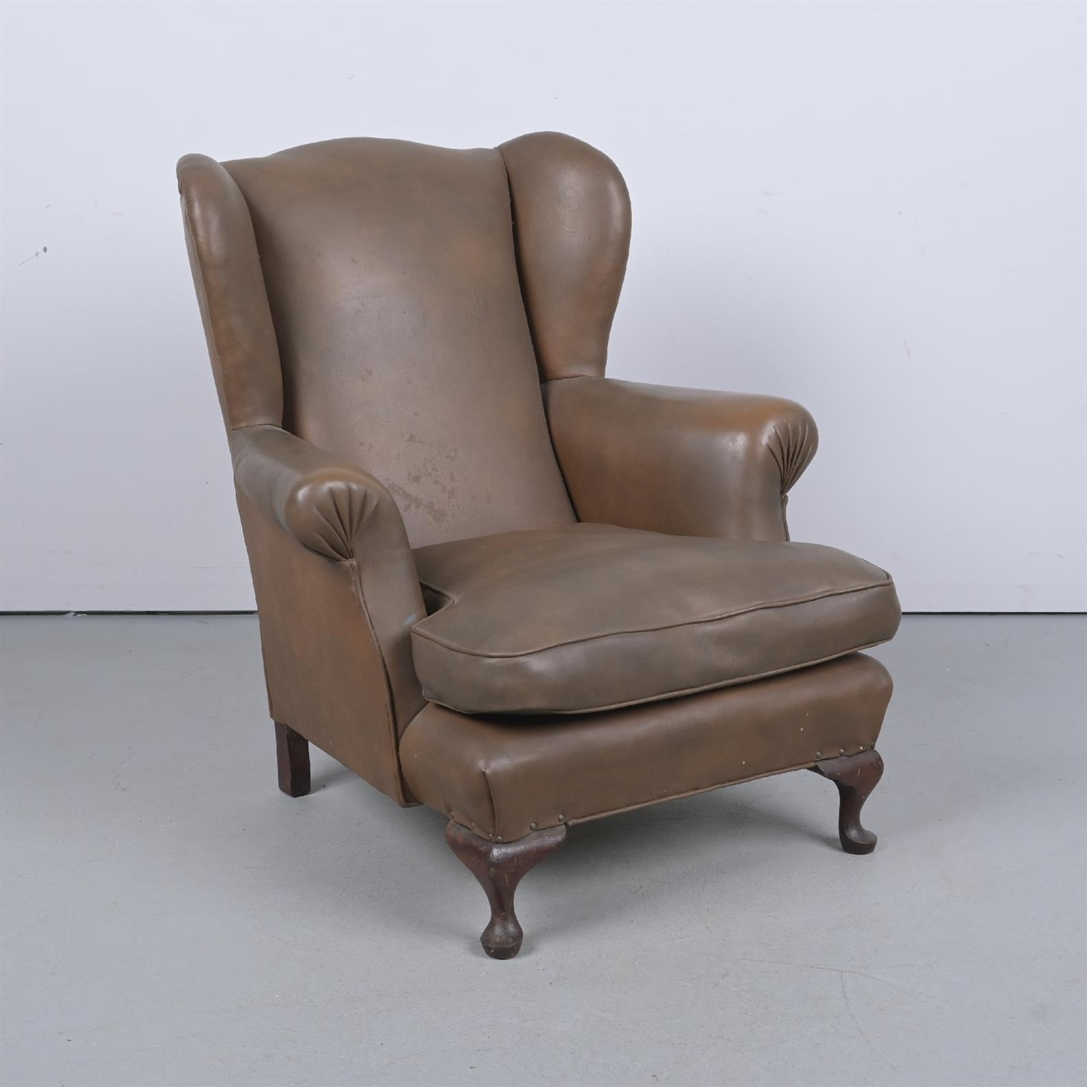 A LEATHER UPHOLSTERED WINGED ARMCHAIR (A/F) (100H X 87W X 98D CM) (LEONARD JOEL DELIVERY SIZE: X-LARGE)