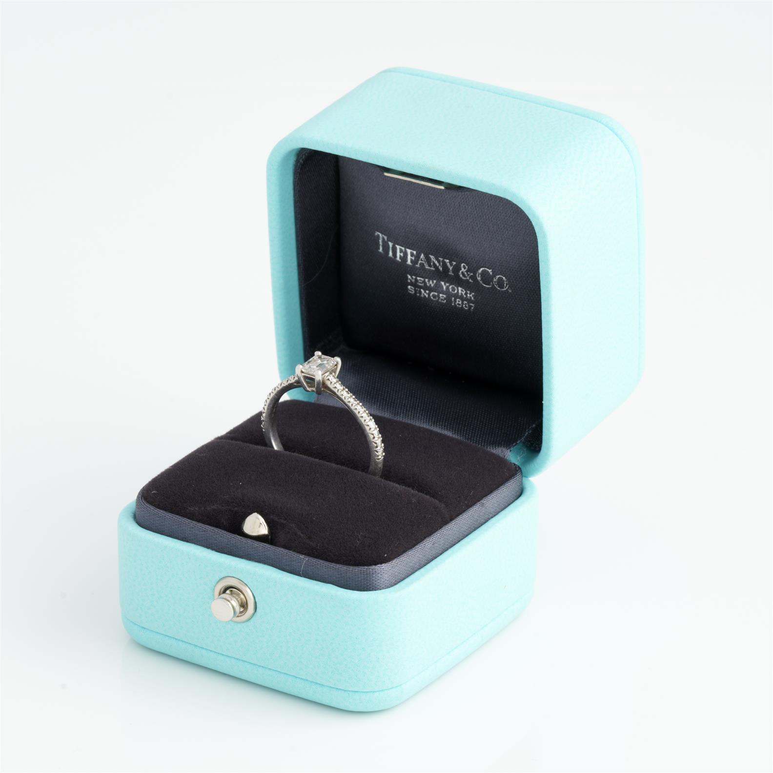 TIFFANY & CO, A DIAMOND RING IN PLATINUM, THE EMERALD CUT DIAMOND WEIGHING 0.41 (F/VVS1), SIZE K, 3.1GMS, ACCOMPANIED BY TIFFANY & CO BOX AND PAPERS