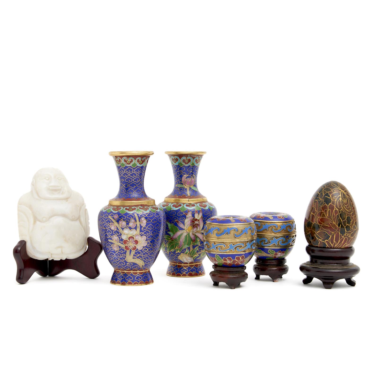 A COLLECTION OF MINIATURE CHINESE CLOISONNE INCL. A PAIR OF VASES, A PAIR OF BOXES WITH STANDS AND AN EGG WITH STAND, WITH A CARVED STONE BUDDHA WITH STAND H.10.5CM (TALLEST) (A/F), LEONARD JOEL DELIVERY SIZE: SMALL