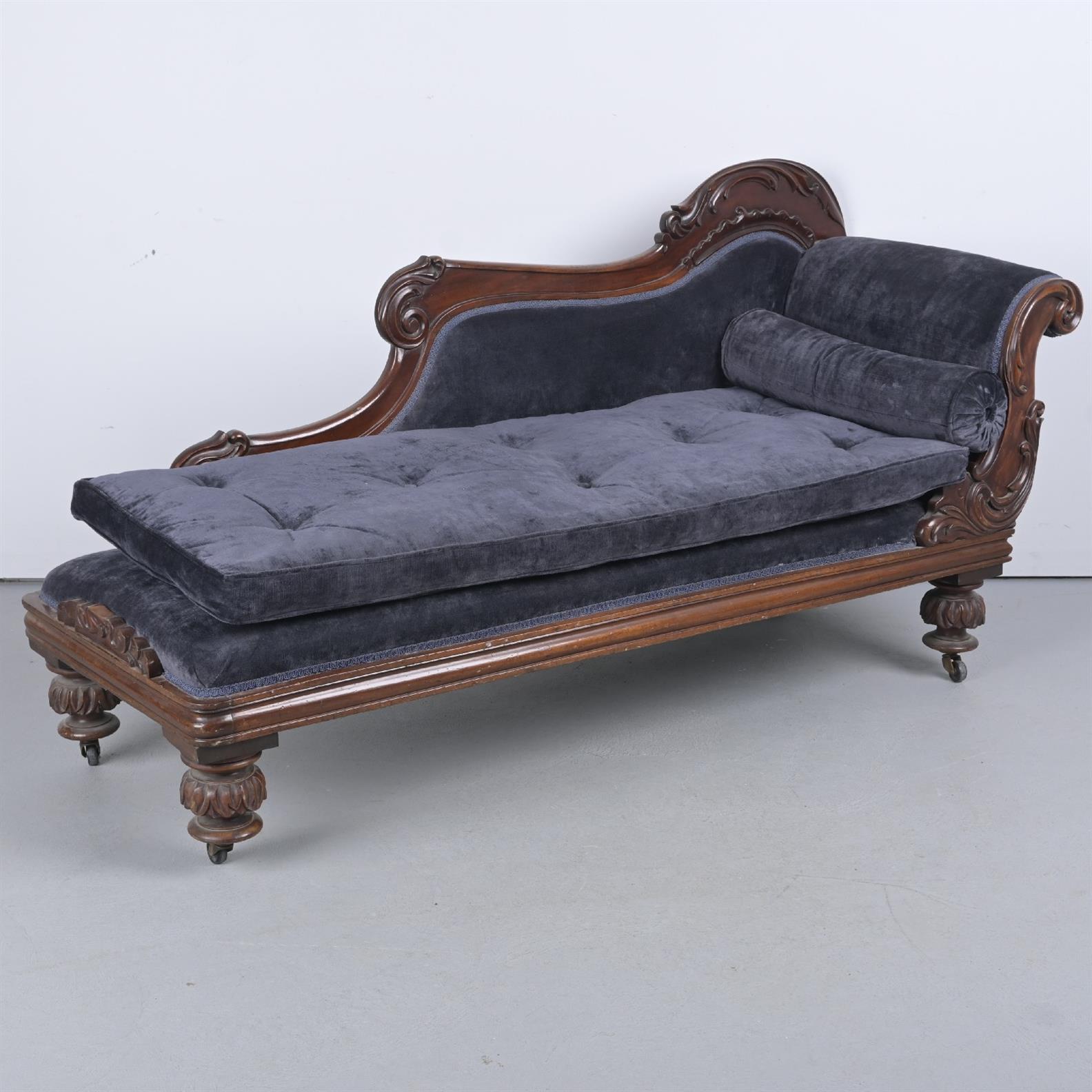 AN EARLY VICTORIAN CHAISE LONGUE, RECENTLY RE-UPHOLSTERED IN BLUE FABRIC (L185 X D65 H93 CM) (LEONARD JOEL DELIVERY SIZE: LARGE)