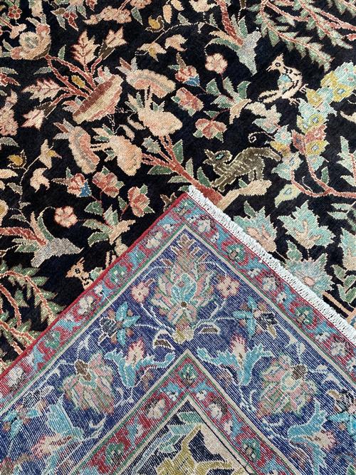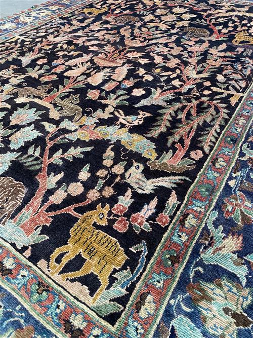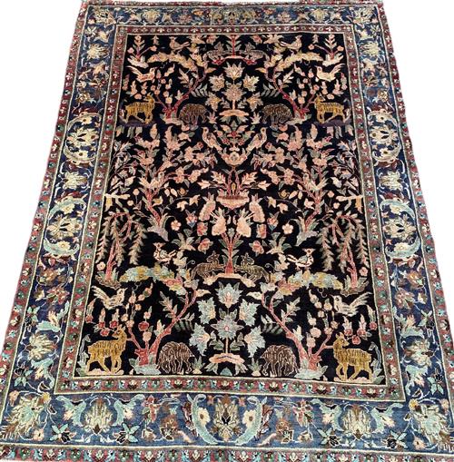 AN UNUSUAL MID-20th CENTURY ARMANIBAFT BAKHTIAR, 100% WOOLELN RUG WITH ORGANIC DYES. WOVEN BY ARMENIAN WOMAN WITH A PICTORIAL DESIGN OF SYMMETRICAL FLORAL TREE OF LIFE PATTERNS, SET AGAINST GAZELLES, MOUNTAIN LIONS AND BIRDS OF PARADISE. IN TONES OF CREAM, CORNFLOWER BLUE, PEACH, GREEN AND BROWN SET WITHIN A BLACK FIELD AND FRAMED BY CORNFLOWER BLUE BORDER OF PALMETTES TENDRILS. GALLERY EXHIBITED. ORIGIN: IRAN (285 X 202 CM) (PLEASE NOTE THERE MAY BE SOME COLOUR VARIATION FROM PHOTOGRAPH)